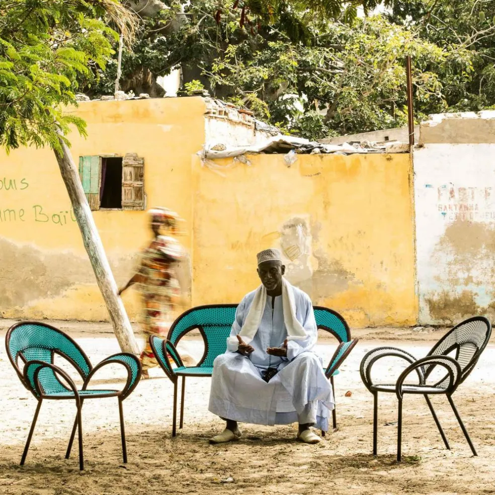 Die einprägsame Flechtstruktur steht im Zentrum des Designprojekts M’Afrique, das im Jahr 2014 begann und sich den Traditionen Afrikas widmet: Dabei flechten afrikanische Handwerker in akribischer Feinarbeit aus Garn den besonderen Stoff – Garn, das sonst für Fischernetze verwendet wird. Dieses umkleidet die lackierte Stahlstruktur, die für Langlebigkeit und Stabilität Sorge trägt. Die Fußgleiter sind aus PVC. Insgesamt wiegt das Sofa 15 kg.