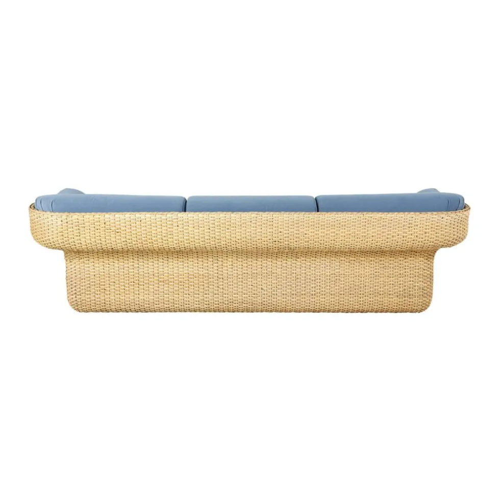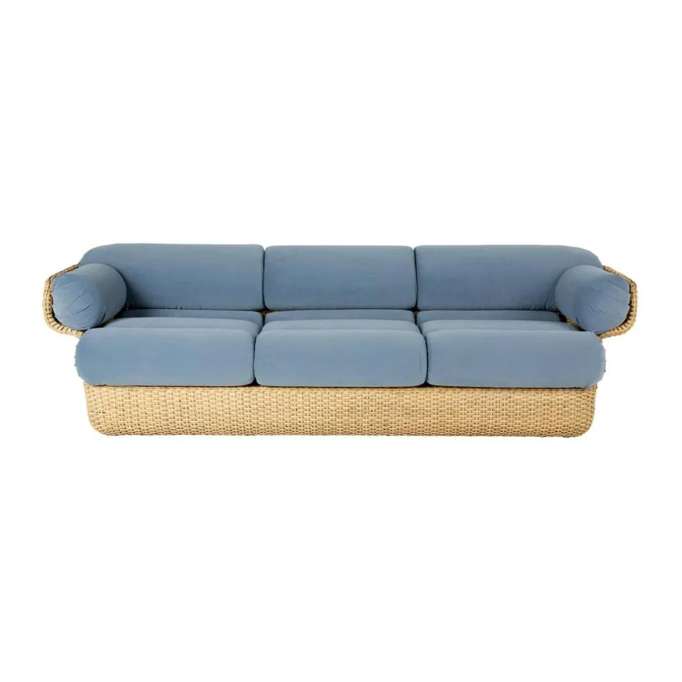 Sein Kern besteht aus einem robusten Stahlskelett. Ein handgearbeitetes Rattangeflecht bildet die Haut. Damit verfügt das Basket 3-Sitzer Sofa über eine stabile Basis, die mit einer attraktiven Optik beeindruckt. Dicke Schaumstoffpolster bedecken die großzügige Sitzfläche. Zu Walzen geformt, schmiegen sie sich in die formschön nach außen geschwungenen Seitenwände und bieten damit als Rücken- oder Armlehnen eine kuschelige Unterlage. Seine hohe Strapazierfähigkeit verdankt das Basket 3-Sitzer Sofa dem hochwertigen Bezugstoff, der je nach gewählter Ausführung aus Polyester oder einer Polypropylen-Mischfaser besteht. Das bequeme Sitzmöbel schafft eine entspannte Atmosphäre und eignet sich damit nicht nur für das Wohnzimmer. Es kann auch in der Lounge oder Lobby eines Designhotels stehen und passt genauso gut in ein Wellnessrefugium.