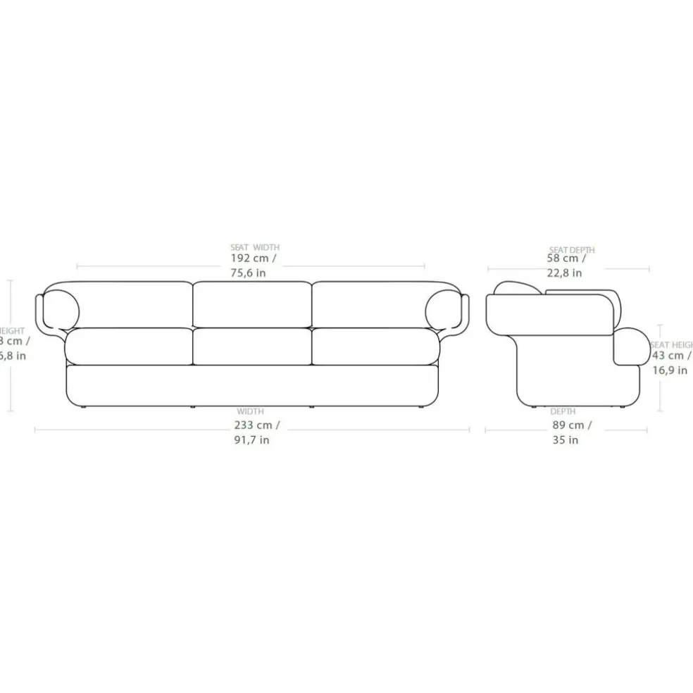 Das Basket 3-Sitzer Sofa ist 233cm breit und 89cm tief. Es hat eine Sitzhöhe von 43cm. Seine Gesamthöhe ist 68cm. Das Designsofa wiegt 54kg und bietet 3 Personen Platz. Zur Auswahl stehen verschiedenfarbige Polsterungen. Im gleichen Design gibt es ein 2-Sitzer-Sofa und einen stylishen Lounge-Sessel.