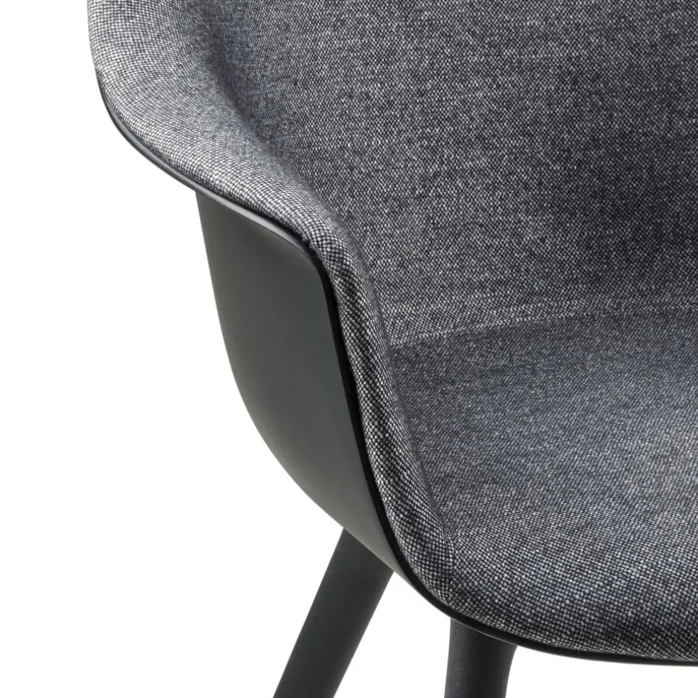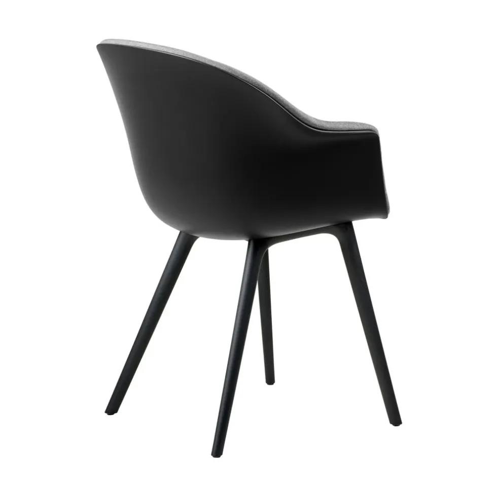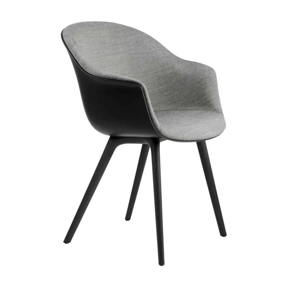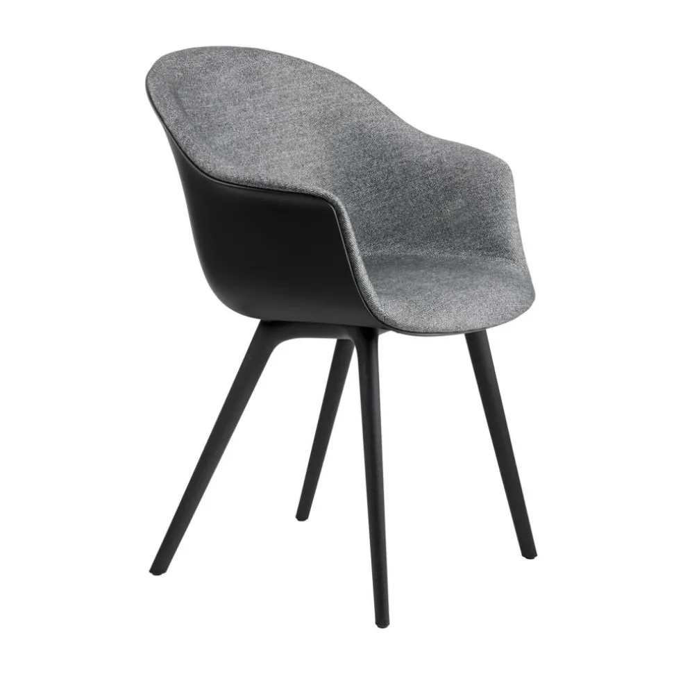 Die großzügige Schale mit ihren hohen, nach außen gebogenen Armlehnen und der rückwärts geneigten Rückenlehne bietet eine komfortable Unterlage. An der Innenseite mit Schaumstoff ausgestattet und mit Stoff bezogen, verspricht sie zudem ein weiches Sitzgefühl. Der strapazierfähige Bezugstoff besteht aus einem Mischgewebe, das je nach gewählter Ausführung einen Wollanteil von bis zu 90% aufweist. Daneben sorgt das Kunststoffgestell mit seinen konischen Beinen für eine moderne Optik. Die ausgestellte Konstruktion schenkt dem Bat Schalenstuhl Frontpolsterung Gestell Kunststoff einen stabilen Stand. So eignet sich der Designstuhl nicht nur für den Esstisch. Er findet auch im Wartebereich einer Praxis oder im Vorzimmer eines Büros Verwendung. Dank der regionalen Produktion, die kurze Transportwege voraussetzt, zeichnet sich der Stuhl als nachhaltige Wahl aus.