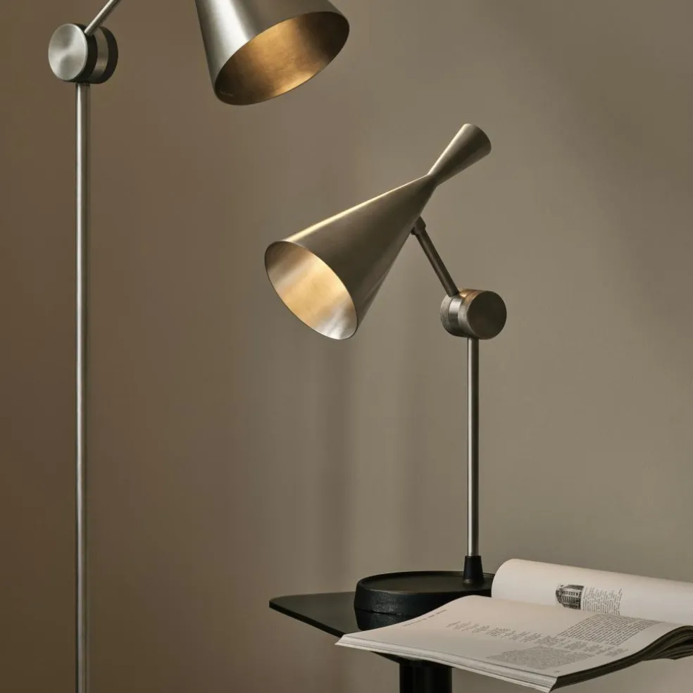 Die Beat Unbeaten LED Tischleuchte von Tom Dixon ist ein eindrucksvolles Beispiel für modernem Design. Gefertigt aus gebürstetem Aluminium mit einem Standelement aus Eisen, strahlt die Leuchte eine kühle industrielle Eleganz aus, die durch das warme Licht des integrierten LED-Moduls auf faszinierende Weise kontrastiert wird.