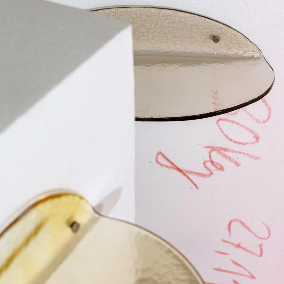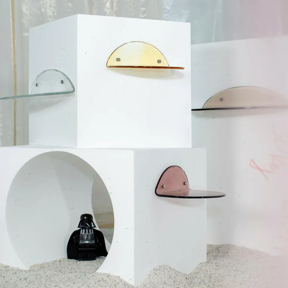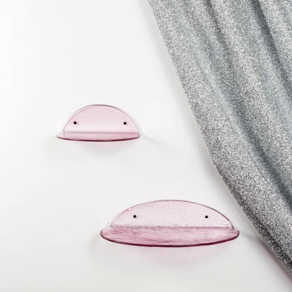Das mit Hilfe von zwei kleinen Schrauben an der Wand zu befestigende Regal ist aus Glas gefertigt. Es besitzt ein raues Finish, das nicht nur eine aufregende Haptik bietet, sondern auch außergewöhnliche Effekte auf der transparenten Oberfläche zaubert. In seiner Form orientiert sich das Regal an Halbkreisen, wobei in diesem Fall zwei Halbkreise mittels eines rechten Winkels aufeinandergestellt wurden. Diese Verbindung von Formen und strengen Winkeln bringt eine ironische Note in Ihr Interieur: Sei es im Badezimmer, im Flur, neben der Eingangstür oder vielleicht sogar im Balkonbereich – nutzen Sie die Chance, mit diesem Wandregal kreativ zu werden.