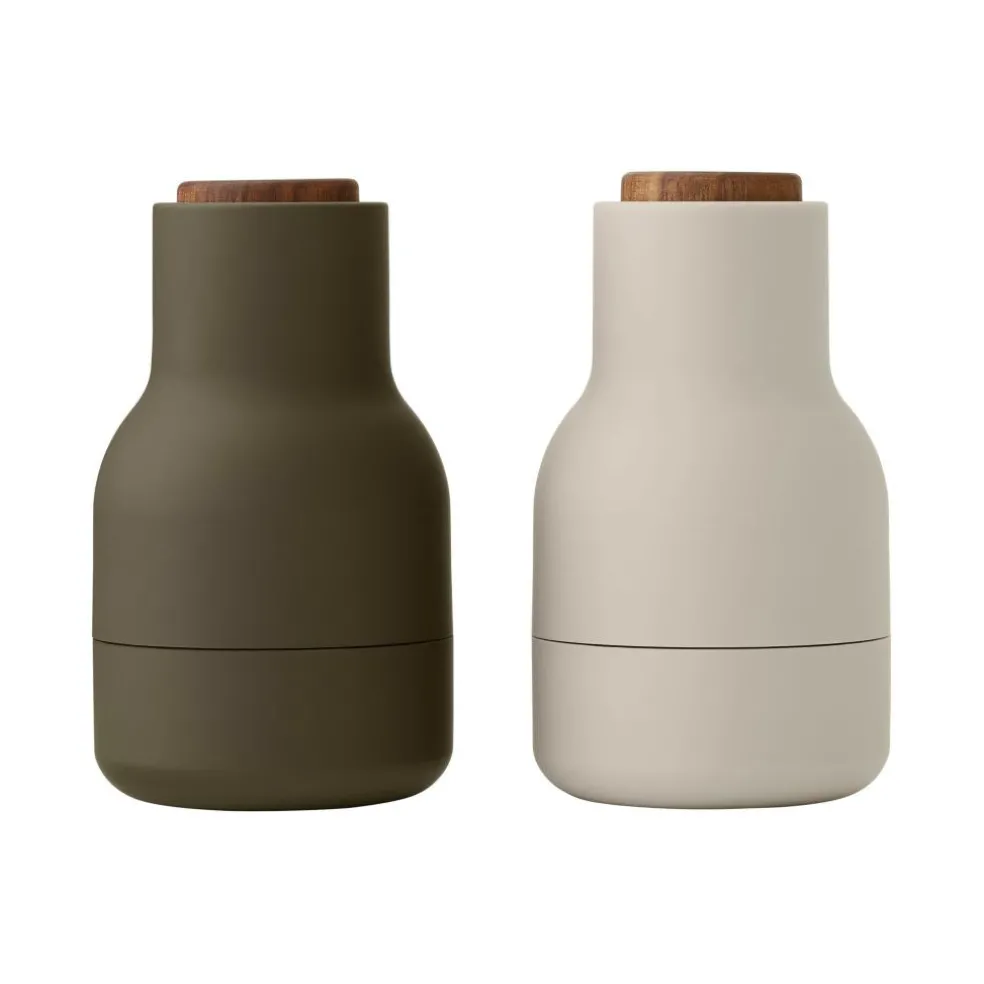 Die Mühlen des Bottle Grinder Small Mühle 2er Sets Deckel Walnuss messen 11,5cm in der Höhe bei einem Durchmesser von 6,8cm und einem Gewicht von 0,26kg. Harmonisch ergänzen sich die unterschiedlichen Farbtöne von Salzmühle und Pfeffermühle in naturverbundenen Erdtönen miteinander. Das Set steht in mehreren Farben zur Auswahl.