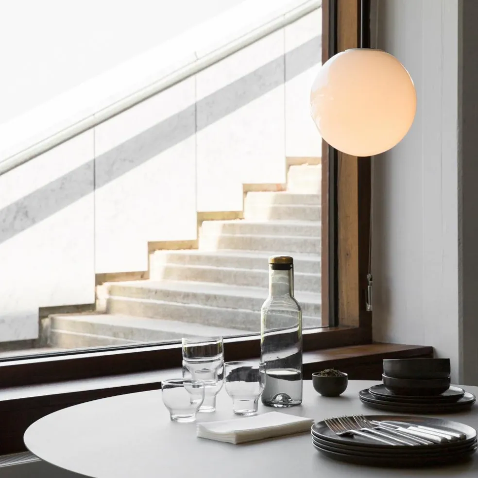Die Bottle Karaffe mit Deckel wurde exklusiv von dem Designstudio Norm Architects für den Hersteller Audo entworfen. Dieser Entwurf ist Teil einer Serie, die mit alltäglichen Objekten spielt und diese in einen neuen Kontext setzt. Die Karaffe wurde von den typischen Weinbrand-Flaschen inspiriert, die über eine charakteristische Unterseite verfügen. Die traditionsreiche Form stellt damit eine Verbeugung vor der Vergangenheit dar, die in der Karaffe spannend in die Neuzeit transferiert wird.