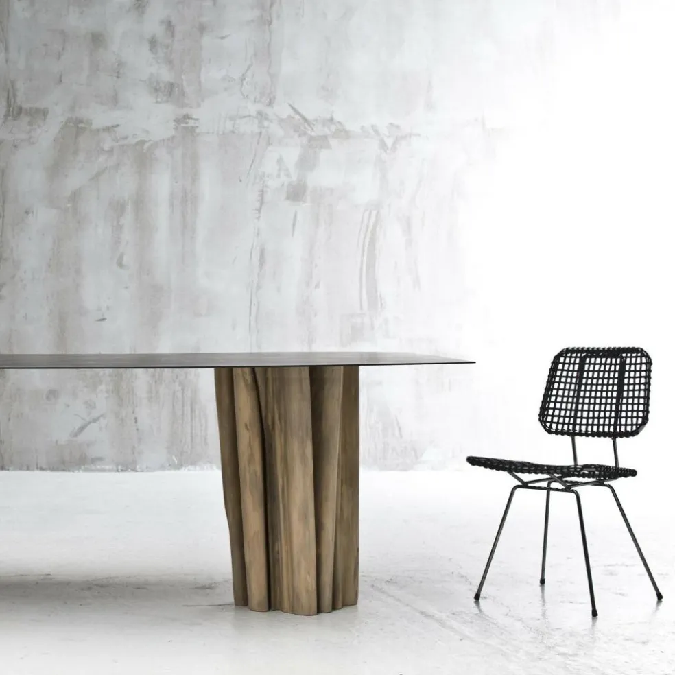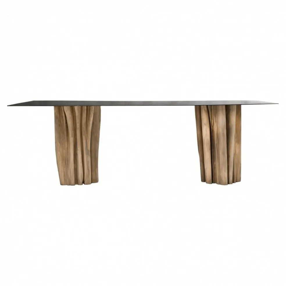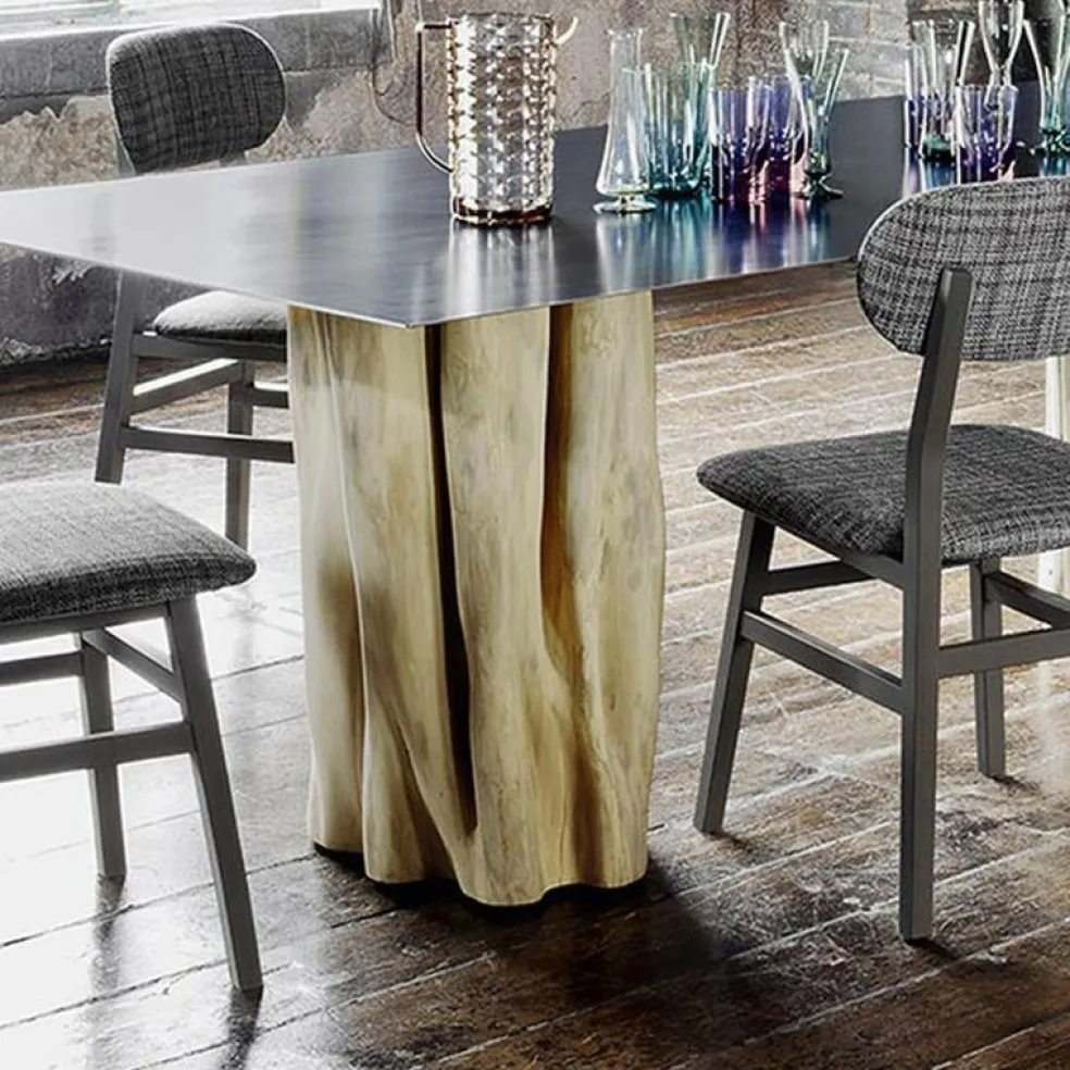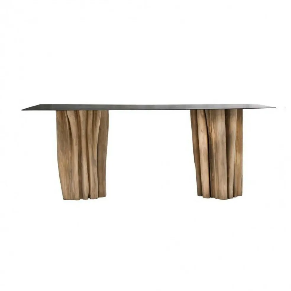 Der Brick Esstisch ist so besonders, dass einem fast die Worte fehlen, aber eben nur fast. Sein absolutes Alleinstellungsmerkmal befindet sich zwischen Tischplatte und Boden und erweckt das Gefühl, ein Stück Wald im Haus zu haben. Denn die Tischbeine sehen vielmehr aus wie Baumstämme, allerdings in trefflicher Handwerkskunst veredelt und künstlerisch bearbeitet. Die Skulpturen, auf denen die stählerne Tischplatte ruht, sind abgerindet und von Hand geschnitzt, und sie bestehen aus Wrightia, einer Holzart, die in der ayurvedischen Tradition sehr beliebt ist.