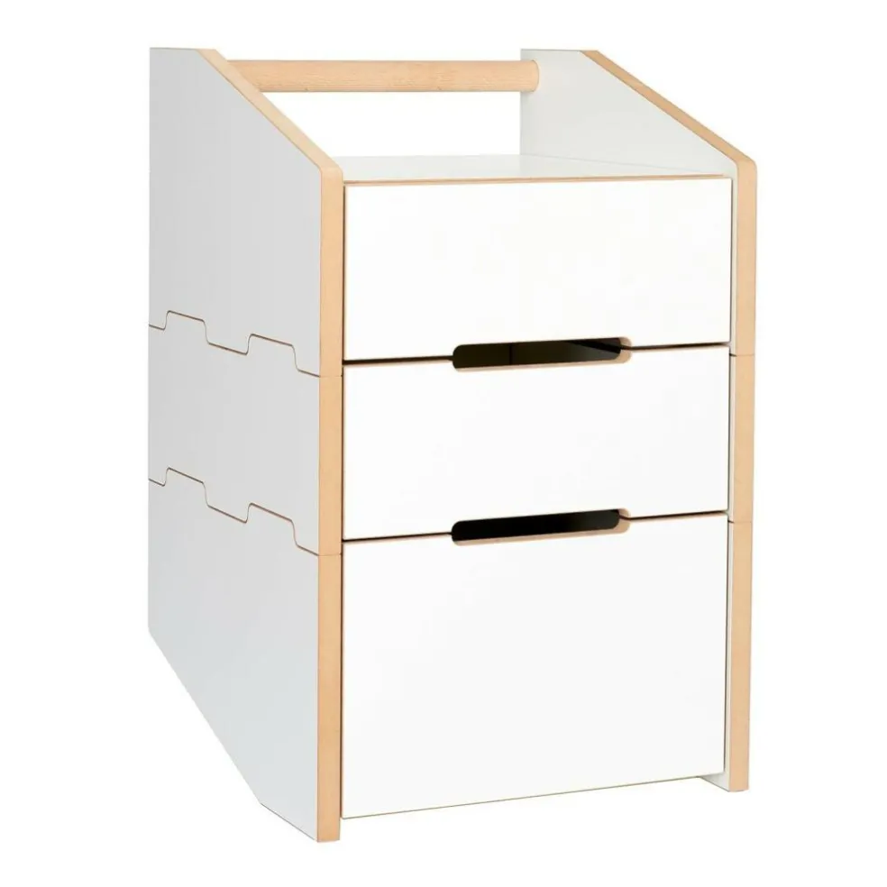 Wer ein praktisches und erweiterbares Möbelstück sucht, ist mit dem Cargo Rollcontainer bestens beraten. In das Grundmodul lassen sich Erweiterungen einsetzen. So wächst das Möbelstück mit, wenn mehr Stauraum benötigt wird. Der Cargo Rollcontainer ist aus MDF hergestellt. Die mitteldichte Holzfaserplatte wird mit Melaminharz versehen. Das macht den Cargo Rollcontainer zum robusten Möbelstück, das man leicht reinigen kann. Drei Schubladen sorgen für Ordnung am Arbeitsplatz oder im privaten Bereich. Die Platte an der Oberseite bildet eine praktische Abstellfläche. Am oberen Modul ist eine Stange befestigt. Damit kann man den Cargo Rollcontainer bequem navigieren. Dank der an der Unterseite befestigten Rollen kann man das Möbelstück leicht verschieben.