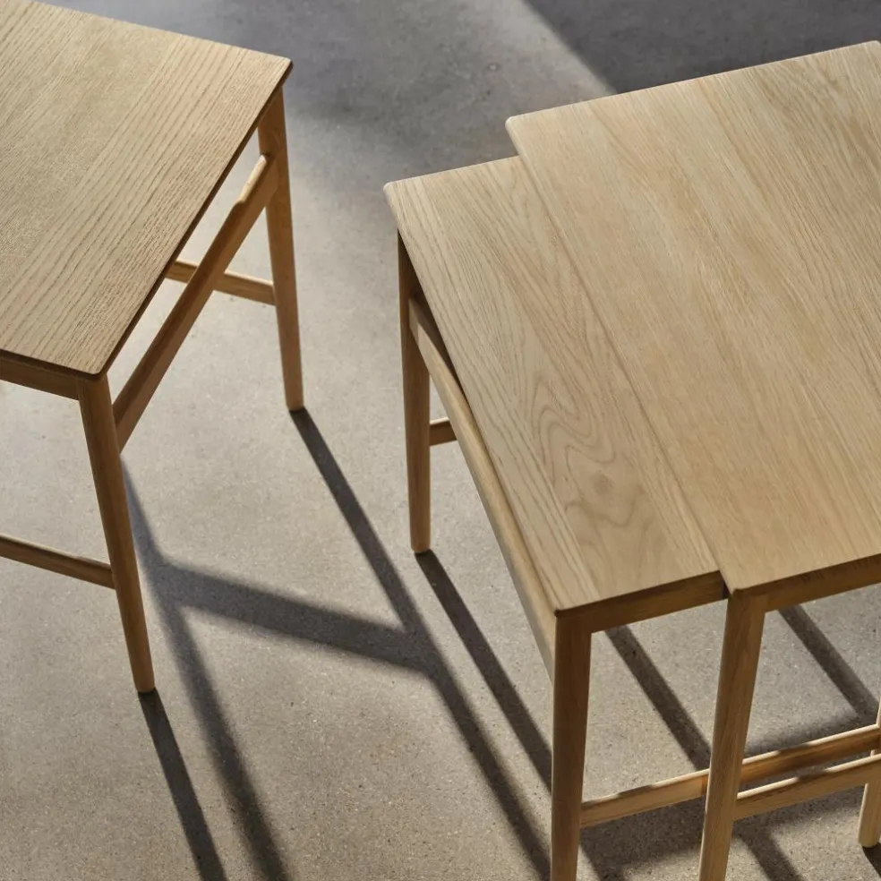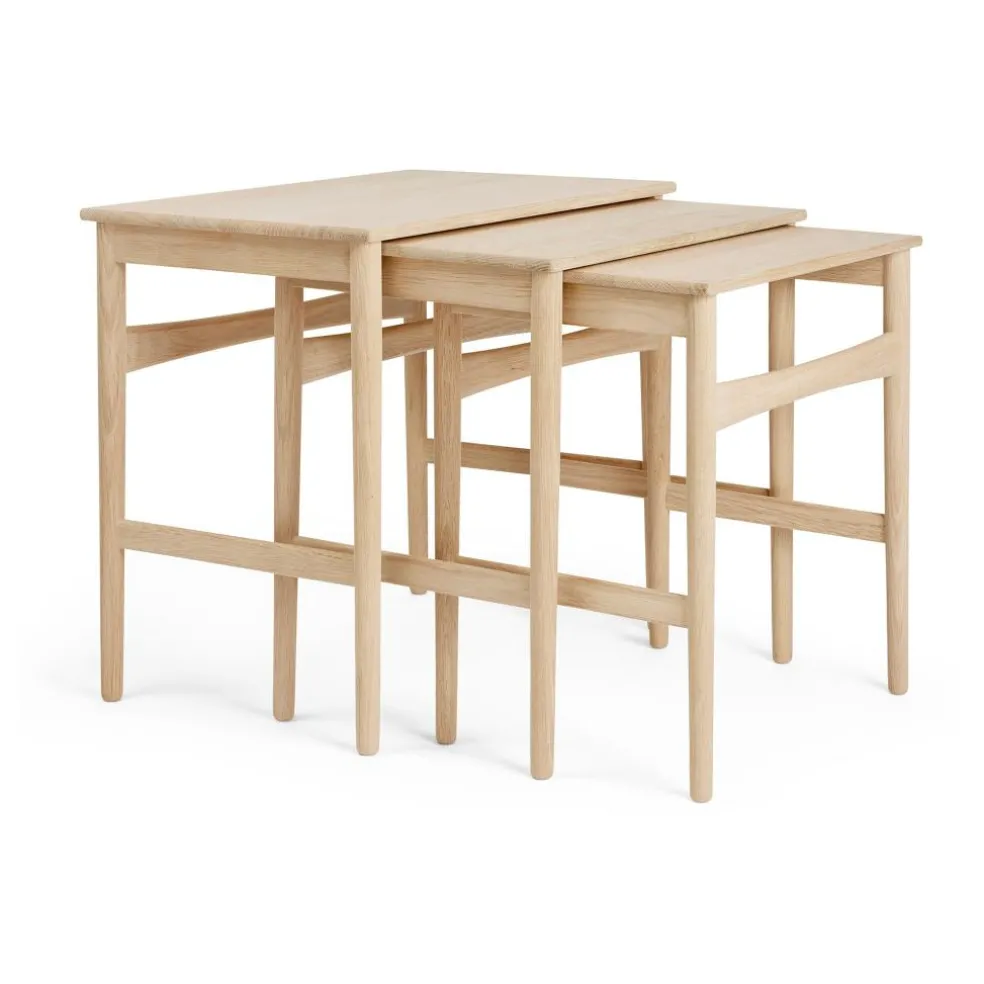 Die drei Tische des CH004 Nesting Tables 3er Sets sind aus wahlweise geölter oder geseifter Eiche mit aus Dänemark stammendem Holz aus FSC®-zertifizierter Herstellung gefertigt. Die jeweils vier leicht konisch zulaufenden Beine mit vier Zwischenstreben bilden einen interessanten Kontrast zur streng rechteckigen Tischplatte mit glatter Kante. Die Tische variieren in ihren Maßen und lassen sich kompakt auf die Maße des größten Tisches mit einer Länge von 52cm, einer Breite von 34cm und einer Höhe von 48cm zusammenschieben. Sie können komplett zusammen-, in Fächeroptik auseinandergeschoben oder einzeln als variationsreiche Beistelltische genutzt werden. Mit ihrem Gesamtgewicht von 7,3kg sind sie ganz nach Bedarf jederzeit flexibel arrangierbare Kleinmöbel im zeitlosen Design, die sich zu vielen Einrichtungsstilen harmonisch ergänzen.