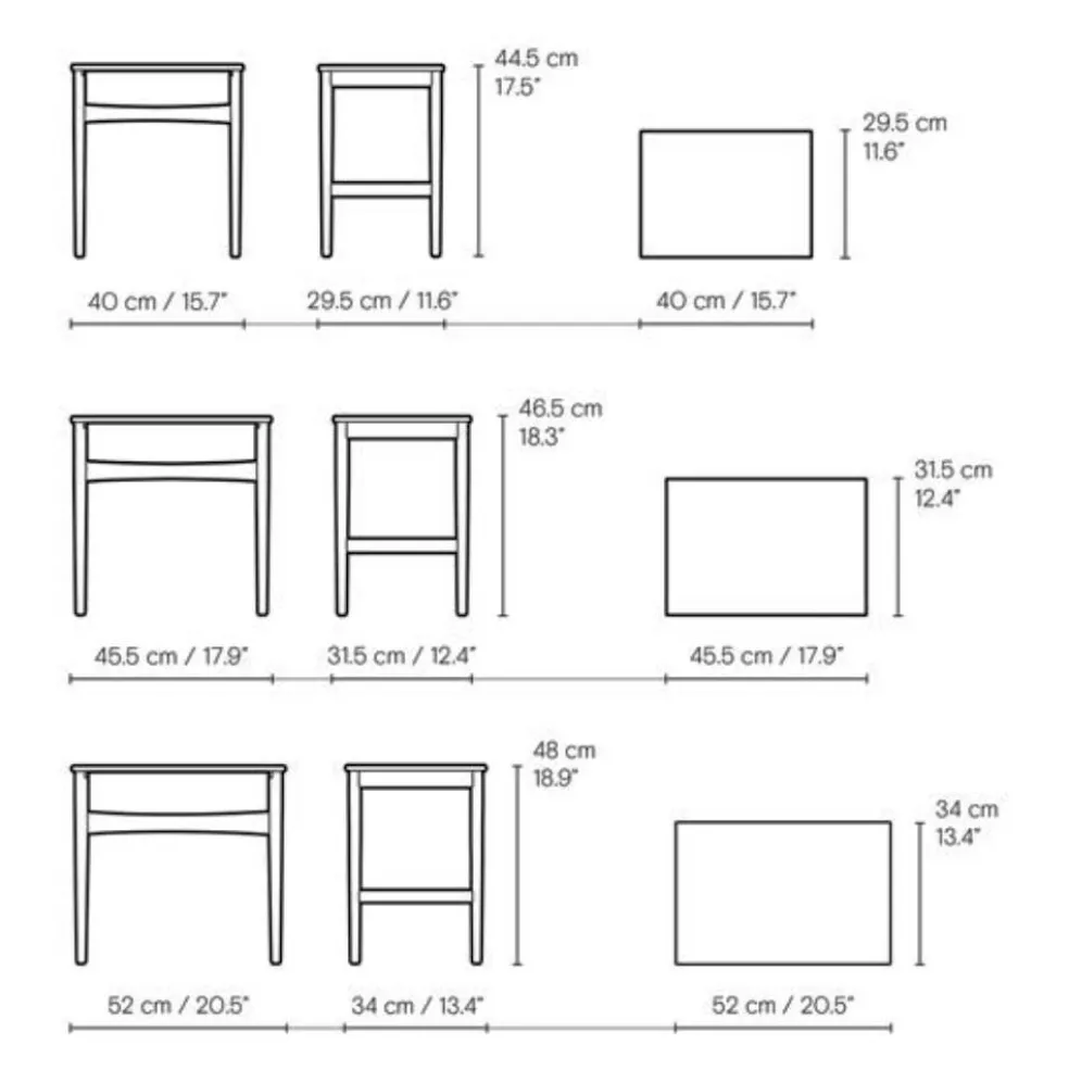 Die beiden kleineren Tische des CH004 Nesting Tables 3er Sets messen 45,5cm in der Länge bei 31,5cm Breite und 46,5cm Höhe beziehungsweise 40cm Länge bei 29,5cm Breite und 44,5cm Höhe.