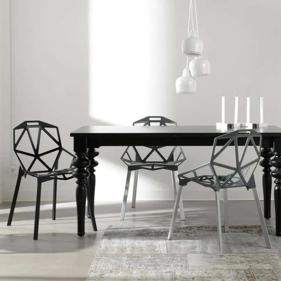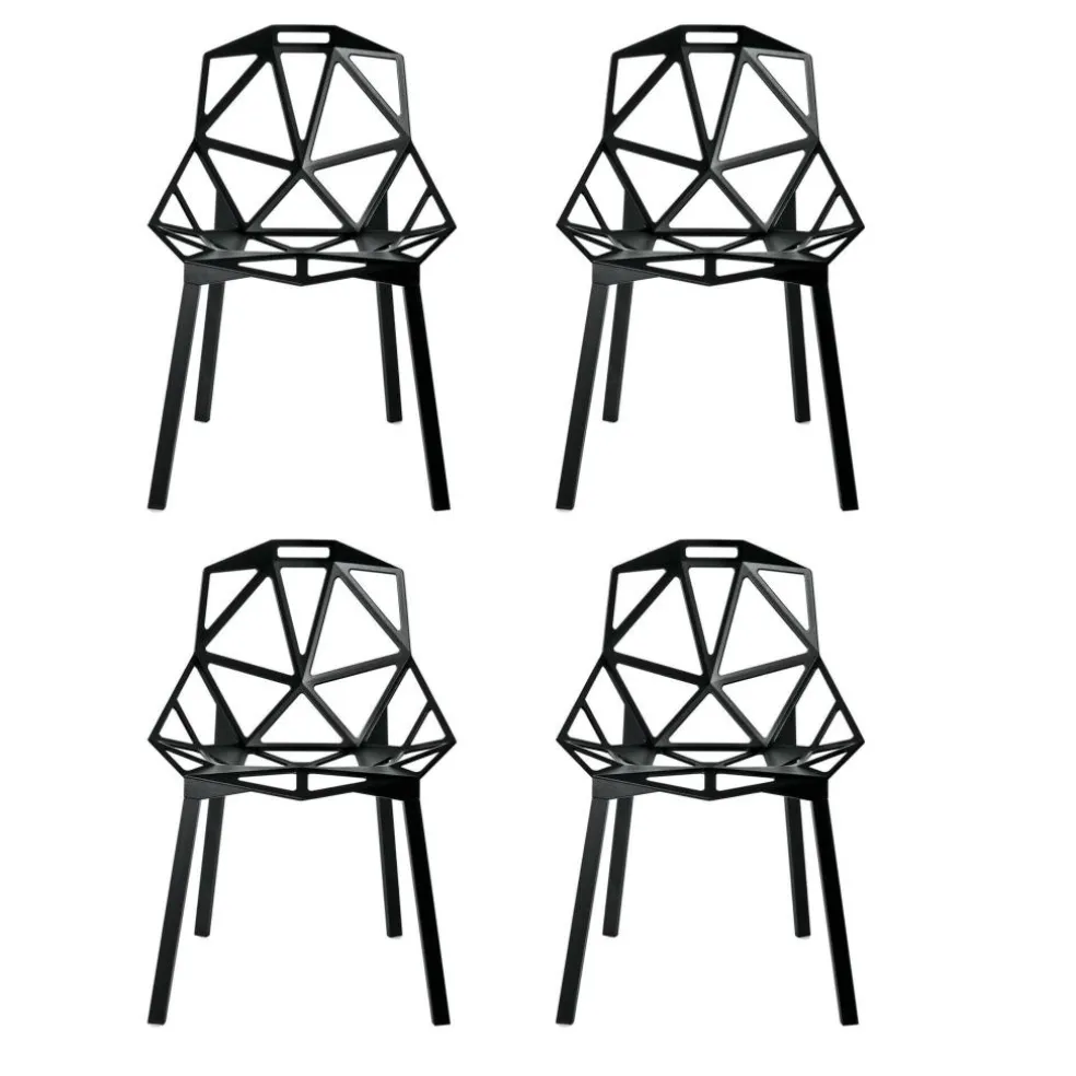Das Chair One Stuhl stapelbar 4er Set trägt das Label Nordic Swan: Das nordische Umweltlabel wurde 1989 ins Leben gerufen und zeichnet nachhaltig hergestellte Produkte aus. Der bekannte Industriedesigner leistete intensive Vorarbeit: Bis er mit dem Design zufrieden war, fertigte er unzählige Skizzen und Prototypen an. So entstand eine markante Sitzschale, die aus Streben zusammengesetzt ist und ein interessantes geometrisches Muster bildet. Gefertigt wird das Chair One Stuhl stapelbar 4er Set aus Profilaluminium, das in einem Druckgussverfahren in die richtige Form gebracht wird. Die Oberfläche hat eine Polyesterlackierung. Die vier Füße sind aus eloxiertem Profilaluminium gemacht.