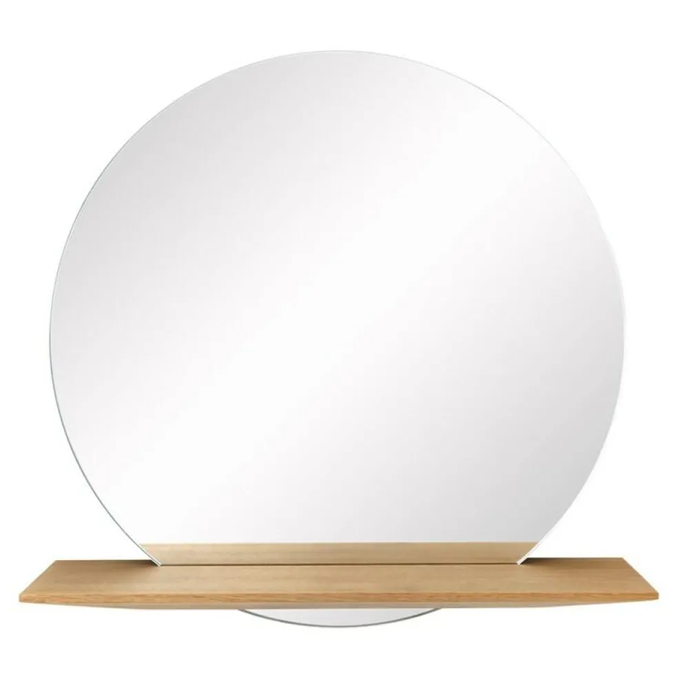 Es geht kaum puristischer: ein Holzbrett mit einem geraden Schnitt und eine rahmenlose Glasfläche, die einfach in dem eingeschnittenen Schlitz steckt. So werden ein Ablagebord und ein Rundspiegel zum stylishen Designobjekt. Die Spiegelfläche ist dadurch nicht nur fix verankert. Sie erhält dank der von der Wand abgesetzten Positionierung eine räumliche Wirkung. Seine elegante Note verdankt das Cut Ablagebord mit Spiegel Ø 75cm den verwendeten Materialien. Hochwertiges Spiegelglas und massives Eichenholz kommen zum Einsatz. Das wahlweise naturbelassene und geölte oder lackierte Bord fügt sich perfekt ins Interieur ein. So passt das Cut Ablagebord mit Spiegel Ø 75cm nicht nur ins Badezimmer, sondern auch neben den Eingang oder in ein Schlaf- oder Gästezimmer. Auch im Sanitärbereich eines schicken Lokals oder in den Zimmern eines Designhotels findet das minimalistische Designstück Verwendung.