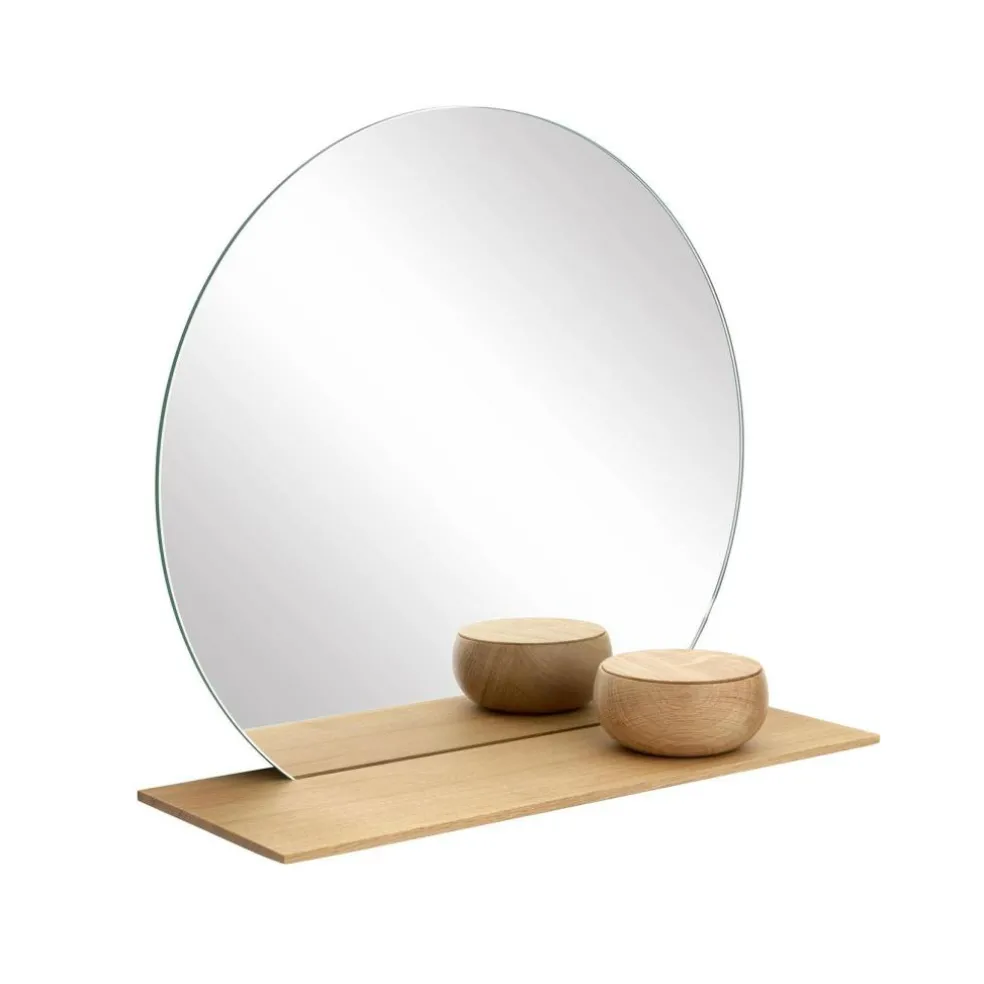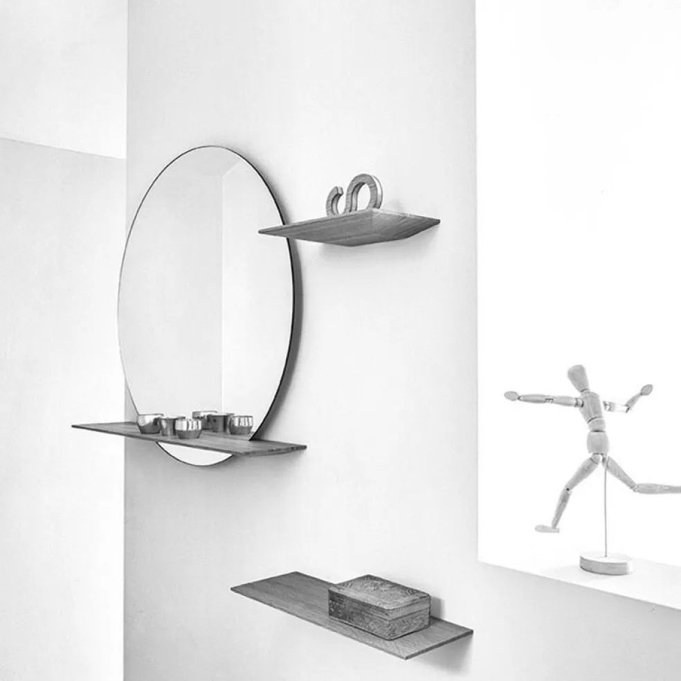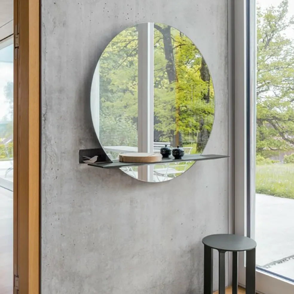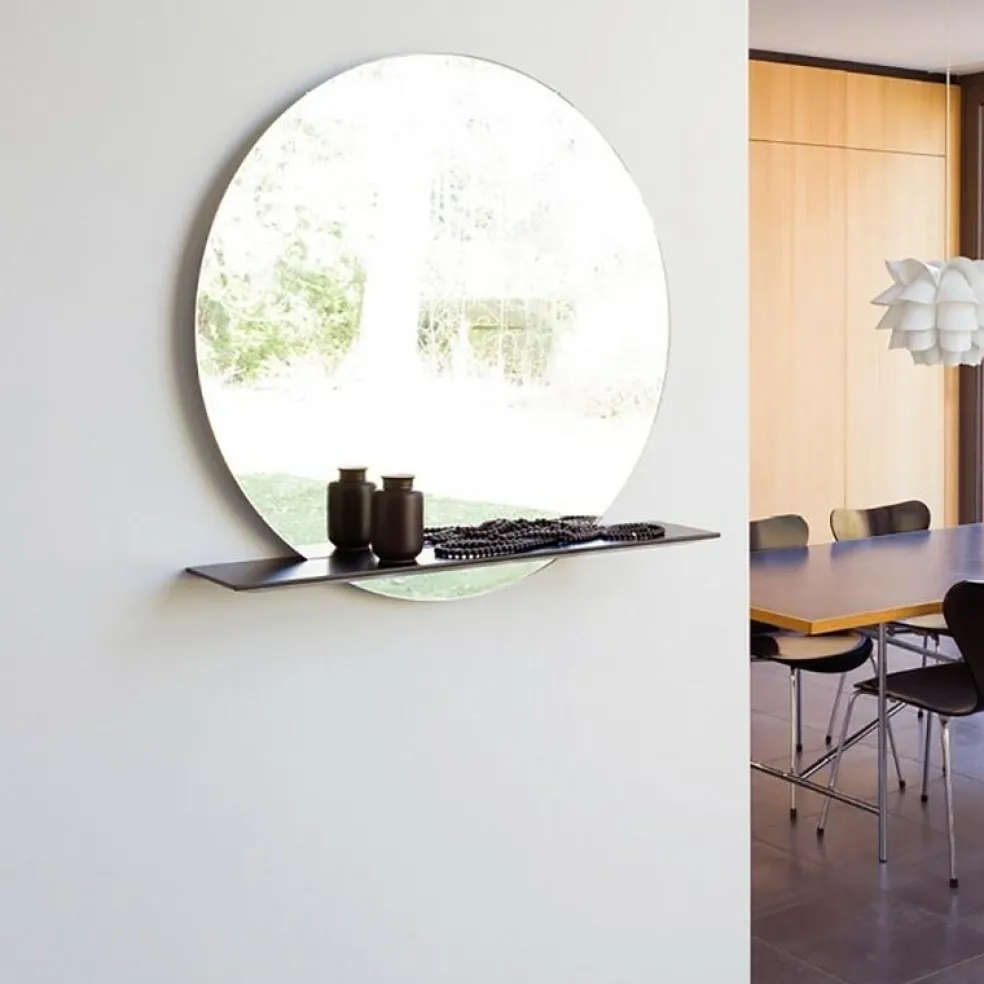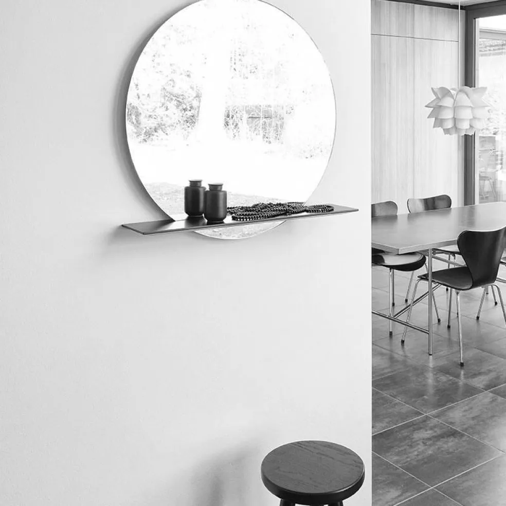 Das Cut Ablagebord mit Spiegel Ø 75cm wurde vom Studio Taschide für die Marke Schönbuch entworfen. Es gehört einer Reihe von modernen Spiegeln an, die auf raffinierte Art mit den dazu passenden Ablagebords kombiniert sind.