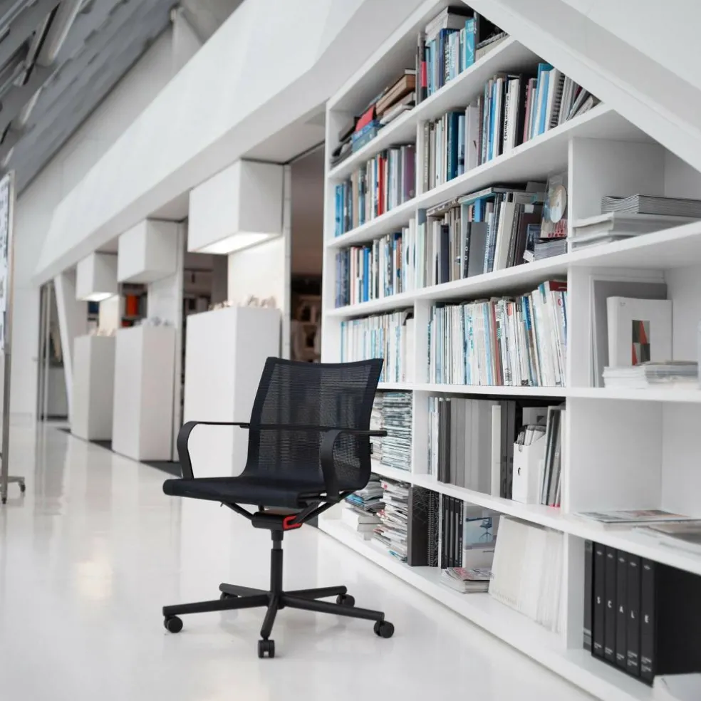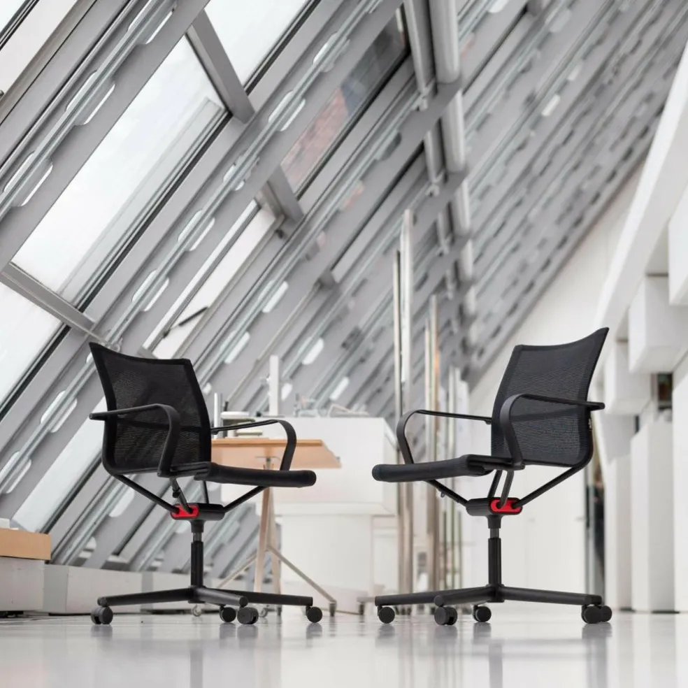 Der D1 Bürostuhl mit Armlehne & Rollengestell wurde von dem Designer Stefan Diez für die Marke Wagner entworfen. Der mittelständische Hersteller aus Bayern gilt wegen seiner konstruktiven Ideen und durch die Verwendung neuer Materialien international als führender Spezialist für Bürostühle. In Zusammenarbeit mit dem Designer und kreativen Ingenieuren entwickelte man das Dondola®-Sitzgelenk, das in alle Richtungen beweglich ist. Dieses dreidimensional bewegliche Gelenk ist das prägende funktionale Element in allen Bürostühlen der Serie D1. Es ermöglicht die ständige Anpassung des Sitzbereiches an kleinste Positionsveränderungen der sitzenden Person. Auch der Winkel zwischen der Rückenlehne und den Armlehnen verändert sich bei jedem Positionswechsel. Diese direkte Anpassung an alle Bewegungen garantiert jederzeit eine optimale Sitzposition und sorgt so für eine deutliche Entlastung der Wirbelsäule.