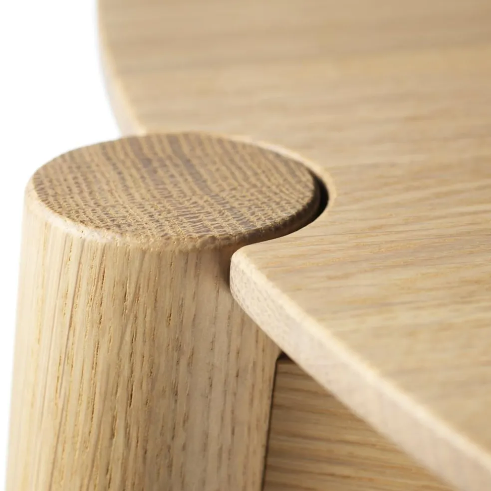 Das Design der D120-Tische fällt durch ein klares Konzept auf: Die kreisrunde Tischplatte gleicht einer Scheibe. Sie liegt auf einem schlanken Dreiecksrahmen auf, der in ein dreibeiniges Gestell eingespannt ist. Die runden Tischbeine laufen nach unten hin konisch zusammen und verleihen dem Designmöbel einen leichten Touch. Ihre leicht ausgestellte Form sorgt für Stabilität. Gefertigt aus nachhaltig produziertem Eichenholz hat der D102 Søs Couchtisch Ø 55cm ein hochwertiges Aussehen, das je nach gewählter farblicher Ausführung eine zarte Maserung zeigt und den Oberflächen eine feine Struktur verleiht. Der D102 Søs Couchtisch Ø 55cm ist ein eleganter Beistelltisch in einer modernen Sofalandschaft oder einer gemütliche Leseecke. Zusammen mit weiteren Couchtischen der Serie passt er in den Warteraum einer Praxis oder in die Hotellobby.