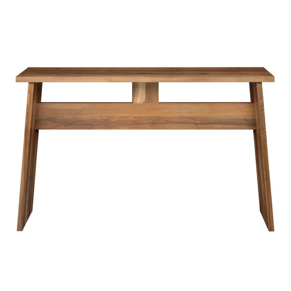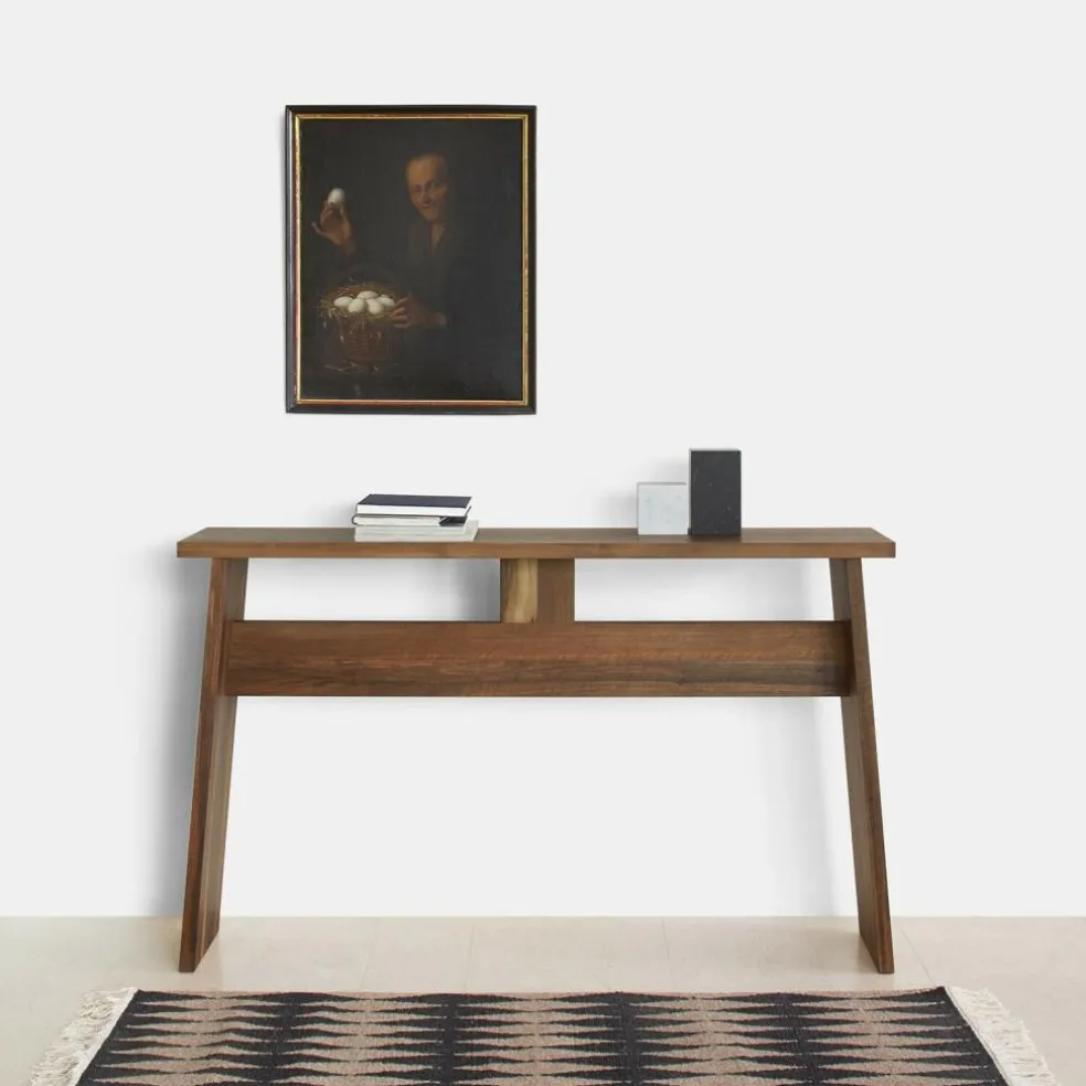 So ikonisch präsentiert sich auch das Drayton Konsole, das 2015 erstmals gezeigt wurde und sich dagegen weigert, als bloße Abstellfläche zu gelten. Die charaktervolle Mittelzarge mit der Breite von 35cm dominiert das 85cm hohe Möbelstück und unterstreicht das strukturelle Konzept der Konsole. Daneben überwiegen die geradlinige Form und der klare Designansatz, die sich hervorragend in moderne Interieurs einfügen. Ganz gleich, ob Sie das stilvolle Konsole im minimalistischen Wohnzimmer als eines der wenigen Möbelstücke richtig in Szene setzen oder dieses Möbelstück im Office als Blickfang und praktische Abstellfläche für Kunstobjekte oder Sporttrophäen nutzen möchten – die natürliche Fertigung und das bodenständige Erscheinungsbild sorgen dafür, dass die Konsole elegant und zurückhaltend wirkt. Das 140cm lange Drayton Konsole ist aus massivem Nussbaumholz aus deutschem Anbau gefertigt und mit einer geölten Oberfläche versehen. Die natürliche Maserung des Holzes macht aus jedem Exemplar dieses Möbels ein individuelles Einzelstück mit viel Charakter und Sinn für das Besondere.