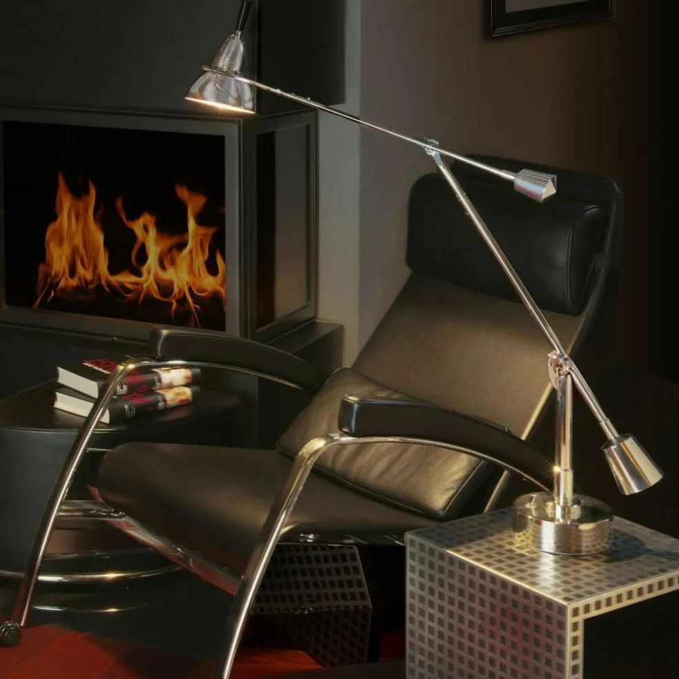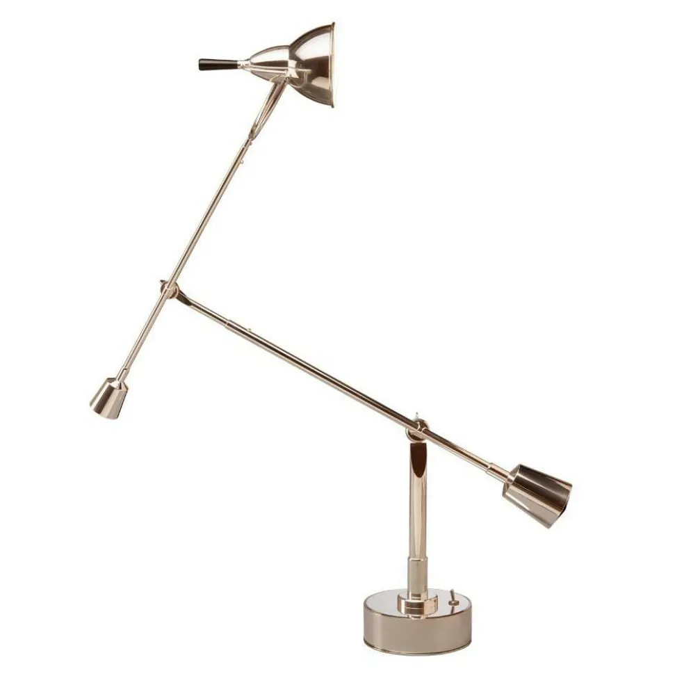 Die EB 27 Buquet Schreibtischleuchte ist ein Meisterwerk an Flexibilität. Sie erlangte Berühmtheit, als sie auf einem Schreibtisch platziert im Salon der Société des artistes décorateurs 1929 ausgestellt wurde. Heute befindet sich ein Original der EB 27 Buquet Schreibtischleuchte im Museum of Modern Art in New York. Ein runder Sockel dient als Basis. Daraus ragt ein Stab in die Höhe. Er ist mit einem Gelenk mit einem dünneren Stab verbunden. Ein Gegengewicht hält die EB 27 Buquet Schreibtischleuchte in der Balance. Ein weiterer Stab, der ebenfalls verstellbar ist, führt zum Leuchtenschirm. Dieser sieht wie eine Glocke aus und ist oben mit einem kleinen Hebel aus Kunststoff ausgestattet. Damit lässt sich auch der Leuchtenschirm verstellen. Die EB 27 Buquet Schreibtischleuchte wird aus vernickeltem Metall gemacht.