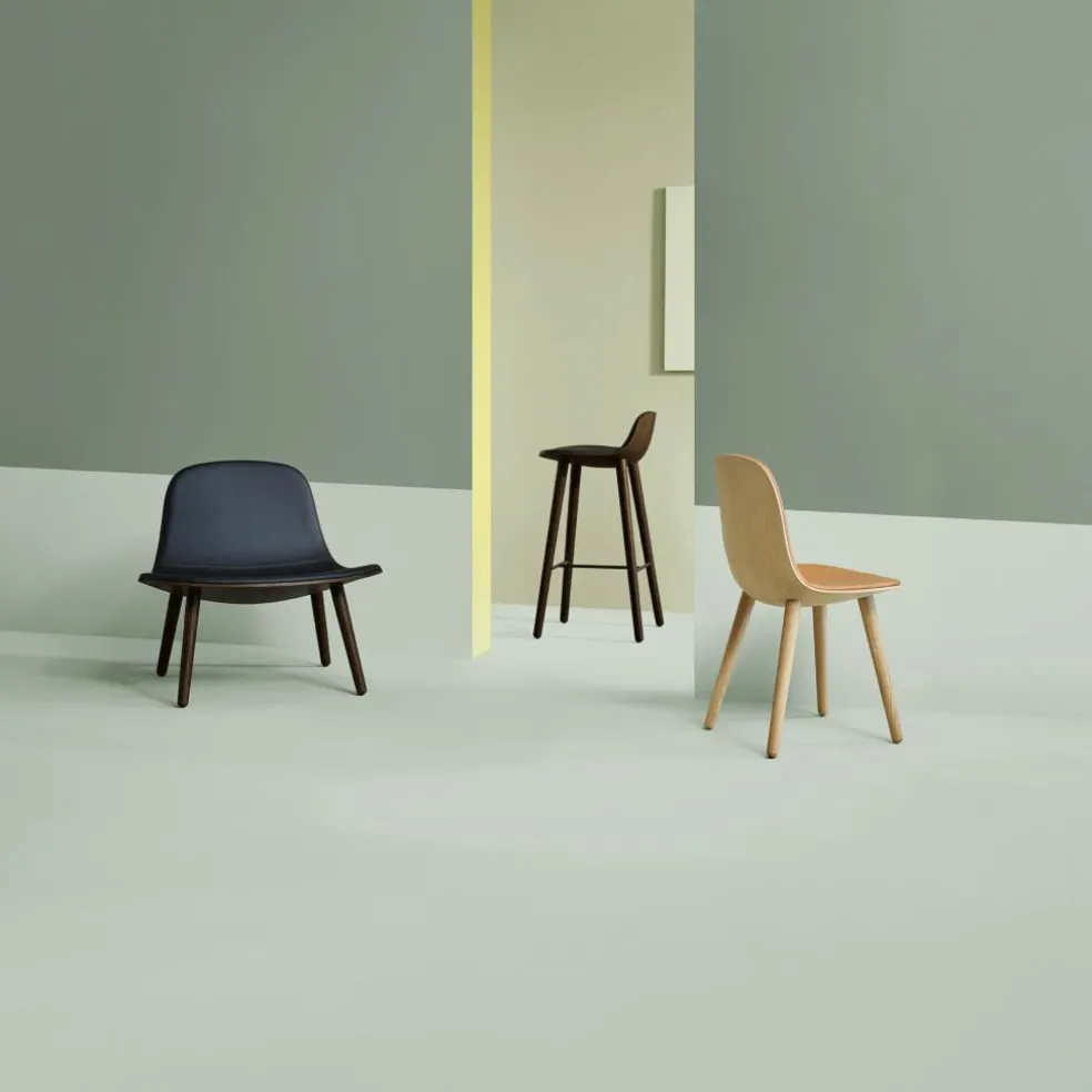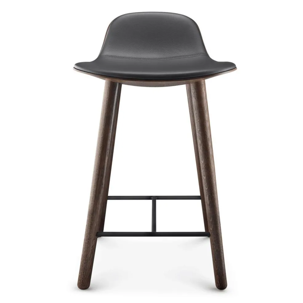 Dem Anspruch ein von allen Seiten ansprechendes Möbelstück zu entwerfen, wurde das Designerstudio voll und ganz gerecht. Die Rückseite der ergonomisch geformten Sitzschale und die vier ausgestellten Beine bestehen aus Eichenholz. Es ist FSC®-zertifiziert, was ihm die Herkunft aus nachhaltiger Forstwirtschaft attestiert. Am unteren Drittel der Beine sind zwei Fußstützen aus Stahl montiert, die mit einer Querstrebe verbunden sind. Höchsten Sitzkomfort bietet die mit Schaumstoff ausgekleidete Sitzschale, die mit ihrer kurzen Rückenlehne den Körper in jeder Position perfekt unterstützt. Der Bezug aus Leder, den es in verschiedenen Farben gibt, rundet das harmonische Gesamtbild ab.