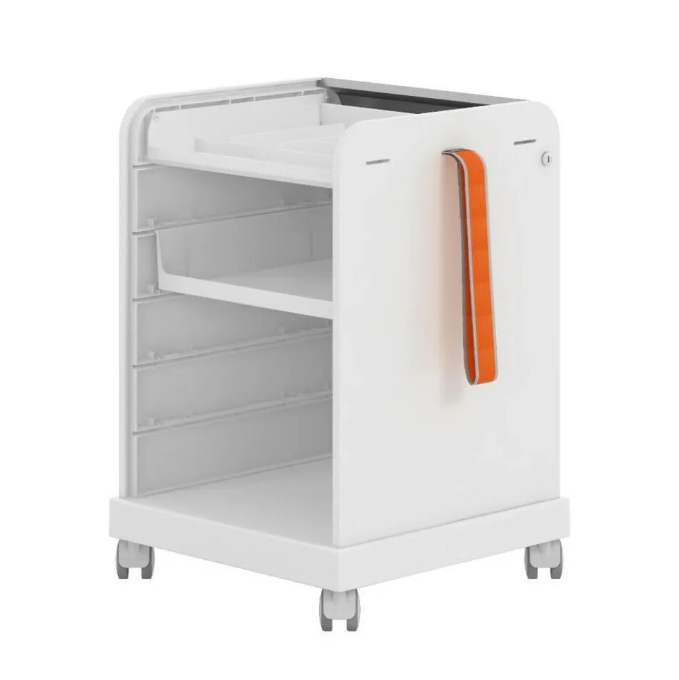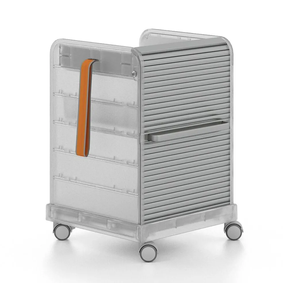Der Rollcontainer ist im modernen Design gestaltet und harmoniert mit jeder Art der Büroeinrichtung. Er eignet sich jedoch nicht nur für Unternehmen, sondern bietet auch im Home-Office viel Stauraum. Weitere Einsatzmöglichkeiten sind das Kinder- und Jugendzimmer. Zwei Schubfächer trennen den Innenraum. Darin können Büromaterial, Ordner und viele andere Gegenstände abgestellt werden. Schließt man den Rollladen, verschwinden die Utensilien. Das Stauraumwunder zeichnet sich noch dazu mit Mobilität aus: vier Rollen ermöglichen die Navigation, ein Ziehgurt erleichtert die Überbrückung weiterer Strecken. Die Seitenwände des Follow Me 1 Rollcontainer bestehen aus Kunststoff. Der Boden und die Verbindungsschale sind aus Stahlblech gefertigt und die Utensilienschale ist ebenfalls aus Kunststoff gemacht. Der Rollladen ist foliert und hat eine ansprechende matte Oberfläche.