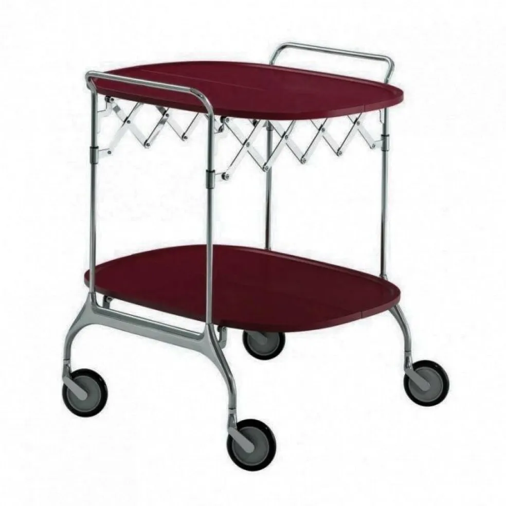 Der Servierwagen/Küchenwagen Gastone ist ein eleganter, ausklappbarer Rollwagen, der sowohl in Ihrer Küche, im Esszimmer, oder im Wohnbereich eine gute Figur macht und Ihnen ganz sicher viele nützliche Dienste leisten wird. Gastone von Kartell besteht aus einem Gestell aus verchromtem Stahl und besitzt zwei Ablageflächen aus lackiertem Kunststoff. Der Servierwagen/Küchenwagen ist bei uns in verschiedenen Farben erhältlich, unter anderem in Blau, Pflaume und Creme. Bitte beachten Sie hierzu unsere „Produktvarianten“.