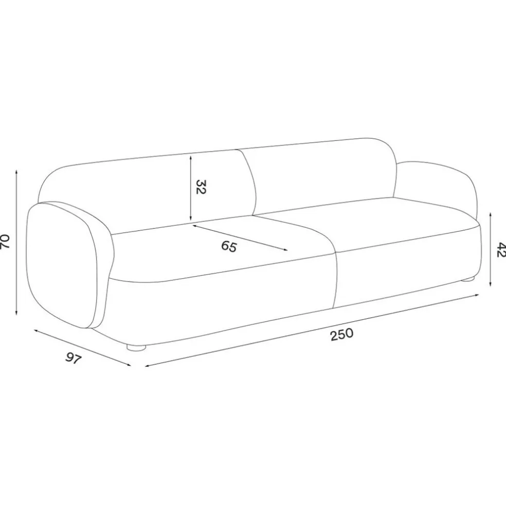Das Gem 3-Sitzer Sofa 250x97cm hat eine großzügige Breite von 250cm und eine Tiefe von 97cm. Seine Sitztiefe misst 65cm. Die Sitzhöhe ist 42cm hoch. Insgesamt hat das Sofa eine Höhe von 70cm. Es wiegt 63kg und ist mit verschiedenfarbigen Bezugsstoffen erhältlich.