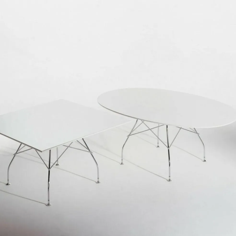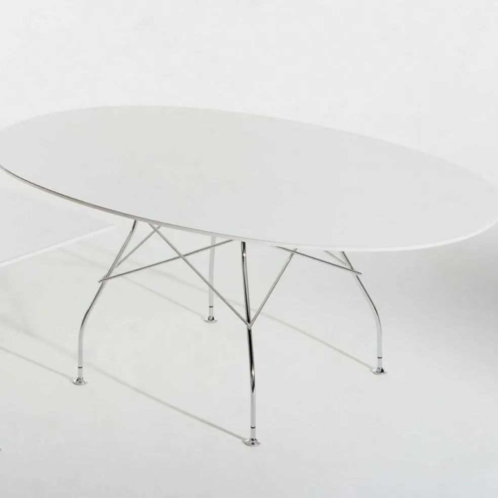 Der Glossy Esstisch oval Gestell Stahl verchromt wurde von Glen Oliver Löw und Antonio Citterio für die Marke Kartell entworfen. Der elegante Tisch wird im Wohn- oder Esszimmer oder im Büro zum beliebten Ort für Gespräche, gemeinsame Mahlzeiten oder Besprechungen. Das zeitlos elegante Modell stammt aus dem Jahr 2001.
