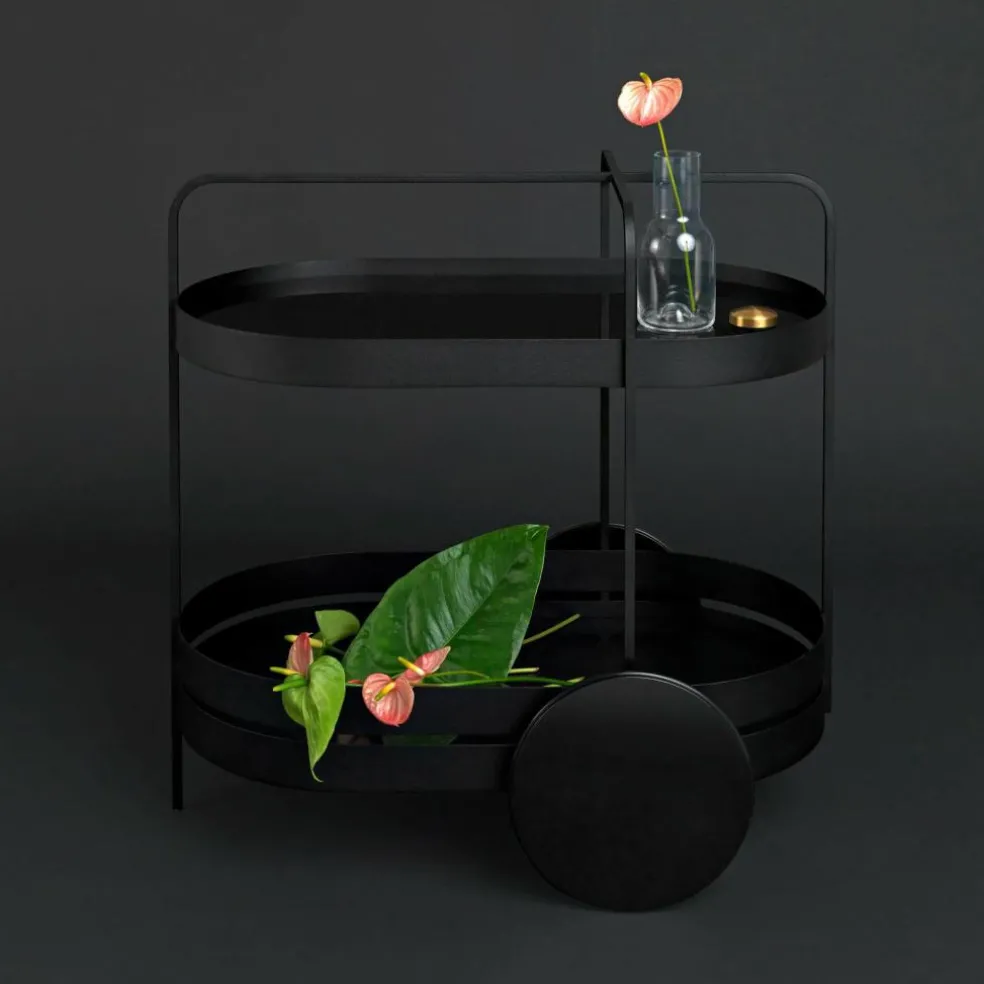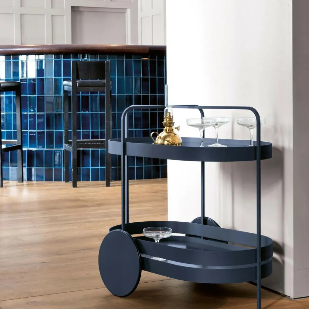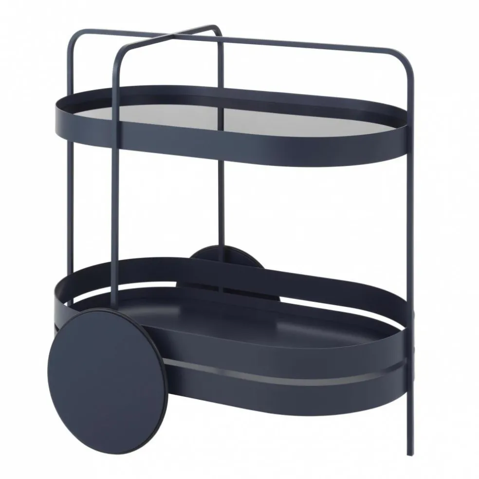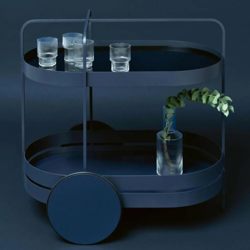 Durch seine runde Formsprache mit Retro-Anklängen ist der Grace Servierwagen eine Art Neuinterpretation des klassischen Servierwagens, denn in seiner Anwendung ist er vielfältig und kann auch als Ablage oder Beistelltisch verwendet werden. Durch seine klare Eleganz fügt er sich harmonisch in diverse Einrichtungsstile ein und kommt in den umwerfenden Farbnuancen „Mitternachtsblau“, „Rosenholz“ und „Schwarz“ daher. Das Material aus pulverbeschichtetem Metall sorgt für robuste Stabilität und Qualität, die obere Ablage aus Glas für Durchsichtigkeit und eine filigrane Wirkung.