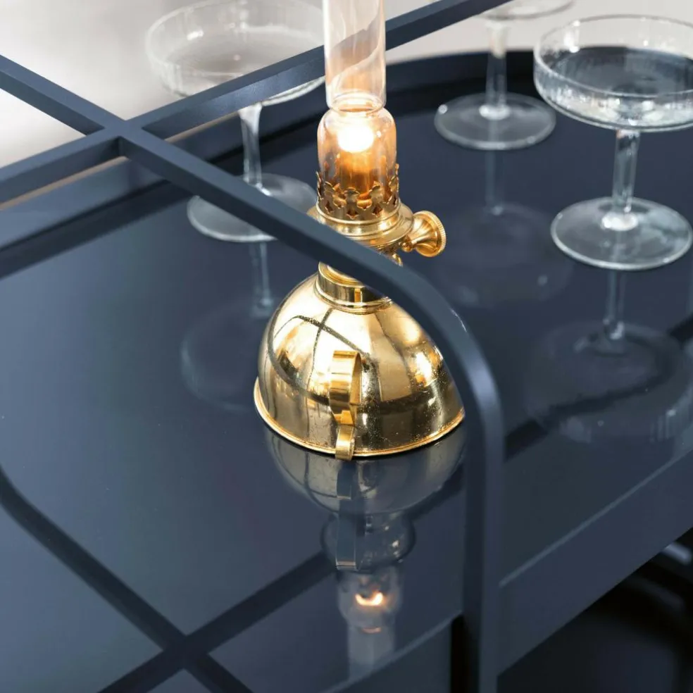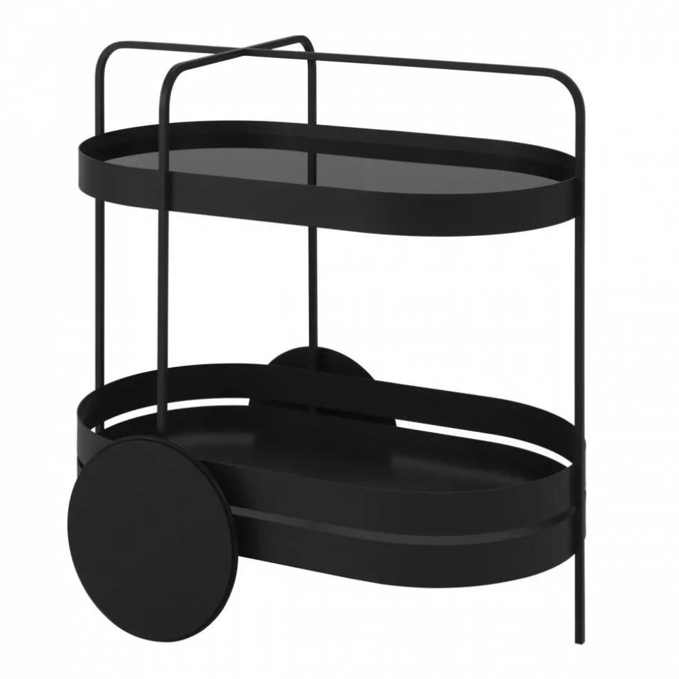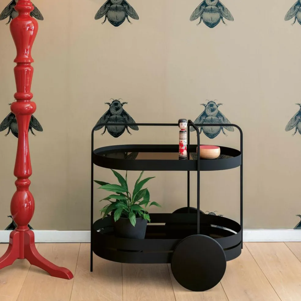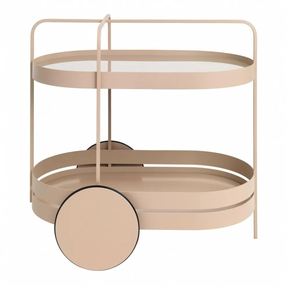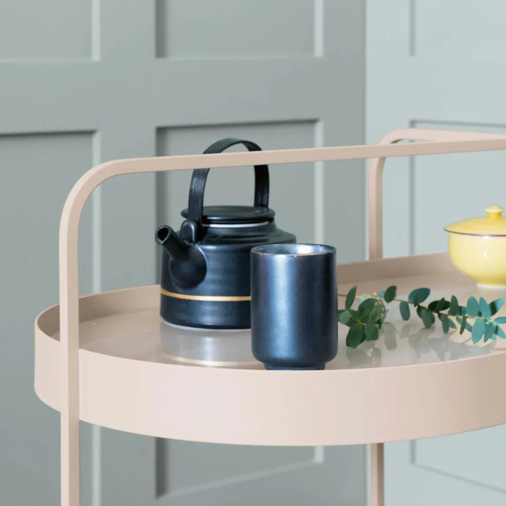 Durch seine runde Formsprache mit Retro-Anklängen ist der Grace Servierwagen eine Art Neuinterpretation des klassischen Servierwagens, denn in seiner Anwendung ist er vielfältig und kann auch als Ablage oder Beistelltisch verwendet werden. Durch seine klare Eleganz fügt er sich harmonisch in diverse Einrichtungsstile ein und kommt in den umwerfenden Farbnuancen „Mitternachtsblau“, „Rosenholz“ und „Schwarz“ daher. Das Material aus pulverbeschichtetem Metall sorgt für robuste Stabilität und Qualität, die obere Ablage aus Glas für Durchsichtigkeit und eine filigrane Wirkung.