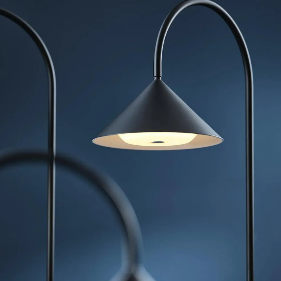 Zwei identisch kegelförmige Elemente bilden bei der Grasp LED Akkuleuchte tragbar H 72cm den Sockel und den Leuchtenschirm. Beide werden von einem stangenförmigen Leuchtenständer verbunden. Seine halbrunde Biegung dient als namensgebender Griff der portablen Leuchte. Bei der integrierten LED handelt es sich um die spezielle Frandsen-ONE-Lichtquelle. Sie hat eine Betriebszeit von 12 Stunden und strahlt ihr 2700K warmweißes Licht mit einem breiten Lichtkegel direkt nach unten. Zur Aufladung mittels SELV-Ladegerät wird die Lichtquelle einfach aus dem Leuchtenschirm genommen. Die Leuchte misst 72cm Höhe bei 32,5cm Tiefe und einem Durchmesser von 15cm. Das Gewicht beträgt 3,08kg. Es gibt sie in verschiedenen Farben und wahlweise aus matt pulverbeschichtetem Edelstahl oder Messing.