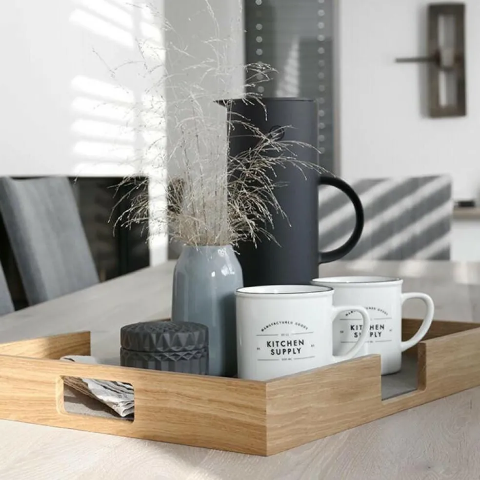 Das HEY-SIGN Tablett misst 47x37cm, hat eine 6cm hohe Umrandung mit praktischen Öffnungen zum Tragen und Servieren. Das Tablett besteht aus geölter, massiver Eiche.