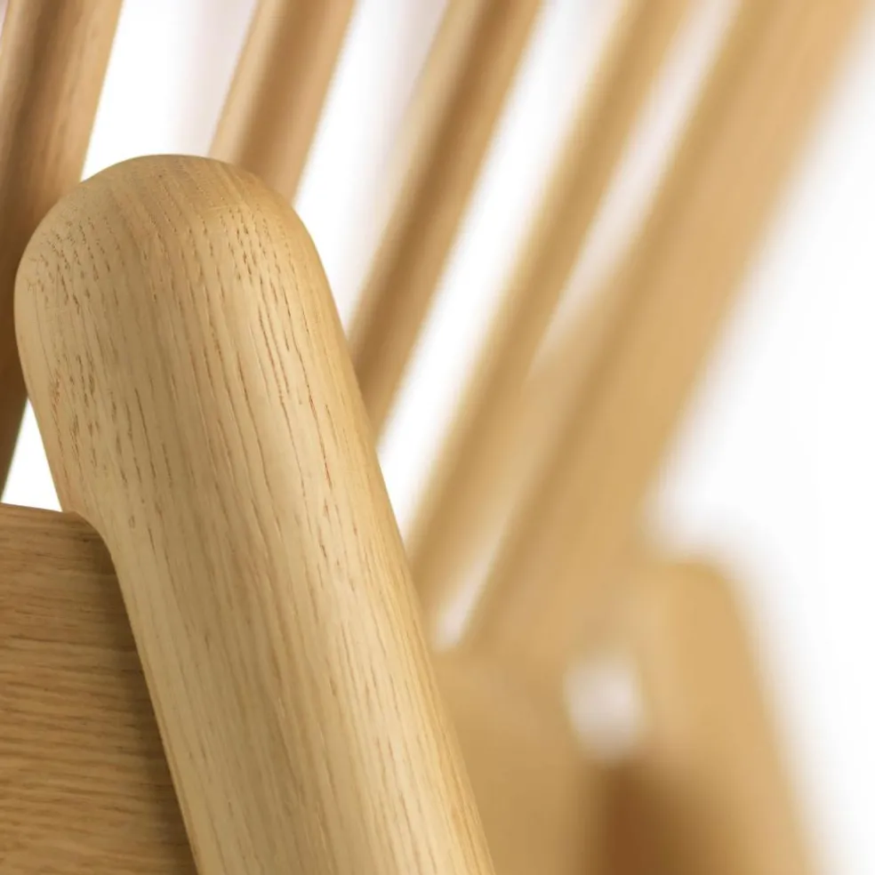 Schon auf den ersten Blick stechen die runden Formen ins Auge, die dem J166 Jørna Sessel Leder einen gemütlichen Touch verleihen. Keine Ecken stören den Sitzkomfort, alle Kanten sind abgerundet. Ein ausladender Bogen mit speichenartigen Füllstäben bildet die Rückenlehne, die sich großzügig nach hinten neigt. Ebenso fällt die Sitzfläche nach hinten hin ab. Mit ihrer Polsterung und dem weichen Lederbezug lädt sie zum Platznehmen ein, während das ovale Lederkissen, das locker über der Rückenlehne hängt, zum Anlehnen lockt. Für höchste Stabilität sorgt der robuste Sesselrahmen, der zwischen zylindrischen Beinen sitzt, wobei die rückwärtigen stark ausgestellt sind. Der formschöne J166 Jørna Sessel Leder ist aus nachhaltigem Eichenholz gefertigt und passt ins private Wohnzimmer, in die Lounge eines Hotels oder in eine gemütliche Designbar.