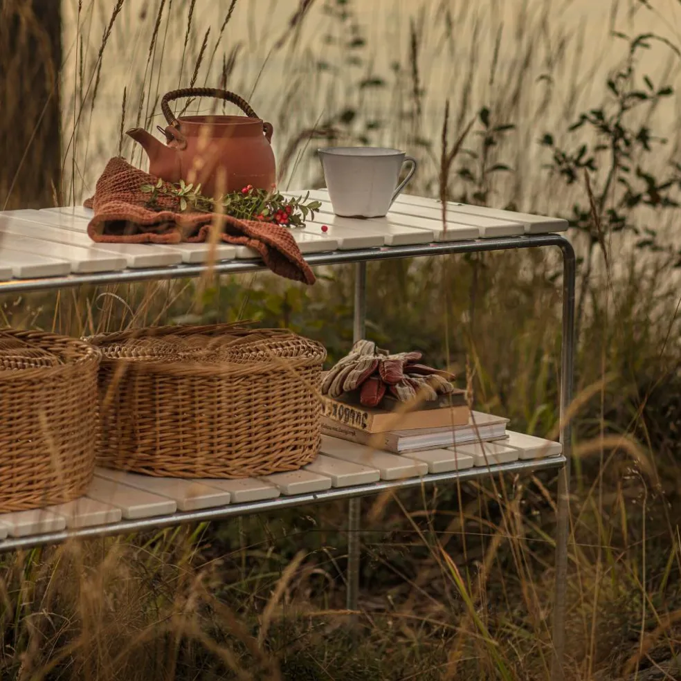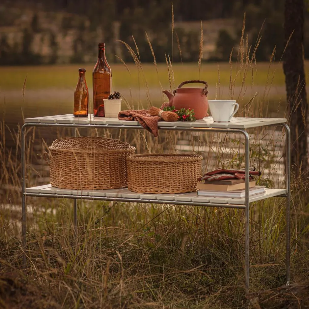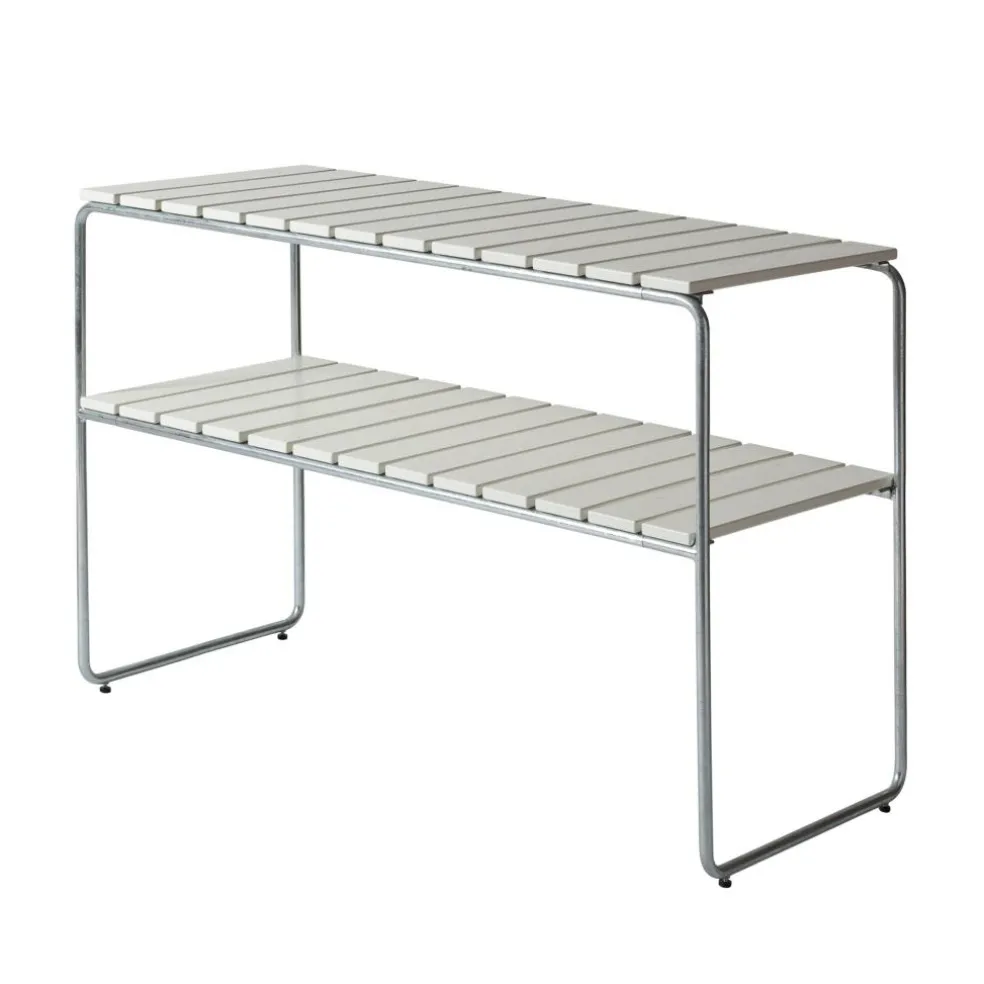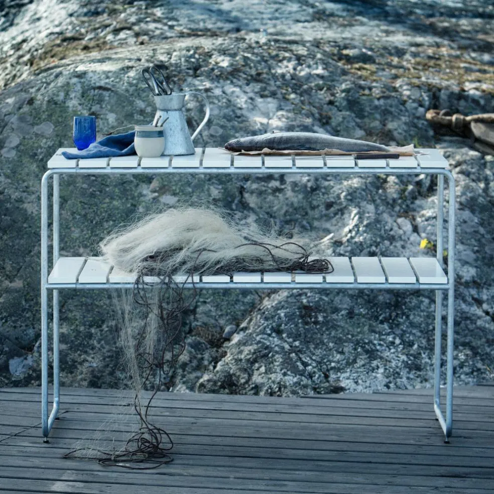 Der L105 Gartenbeistelltisch Eiche wurde von Maria Håård und Jan-Olof Ågren für die Marke Grythyttan entworfen. Mit seinen zwei Ebenen ist das solide gefertigte Modell im Außenbereich vielseitig einsetzbar.