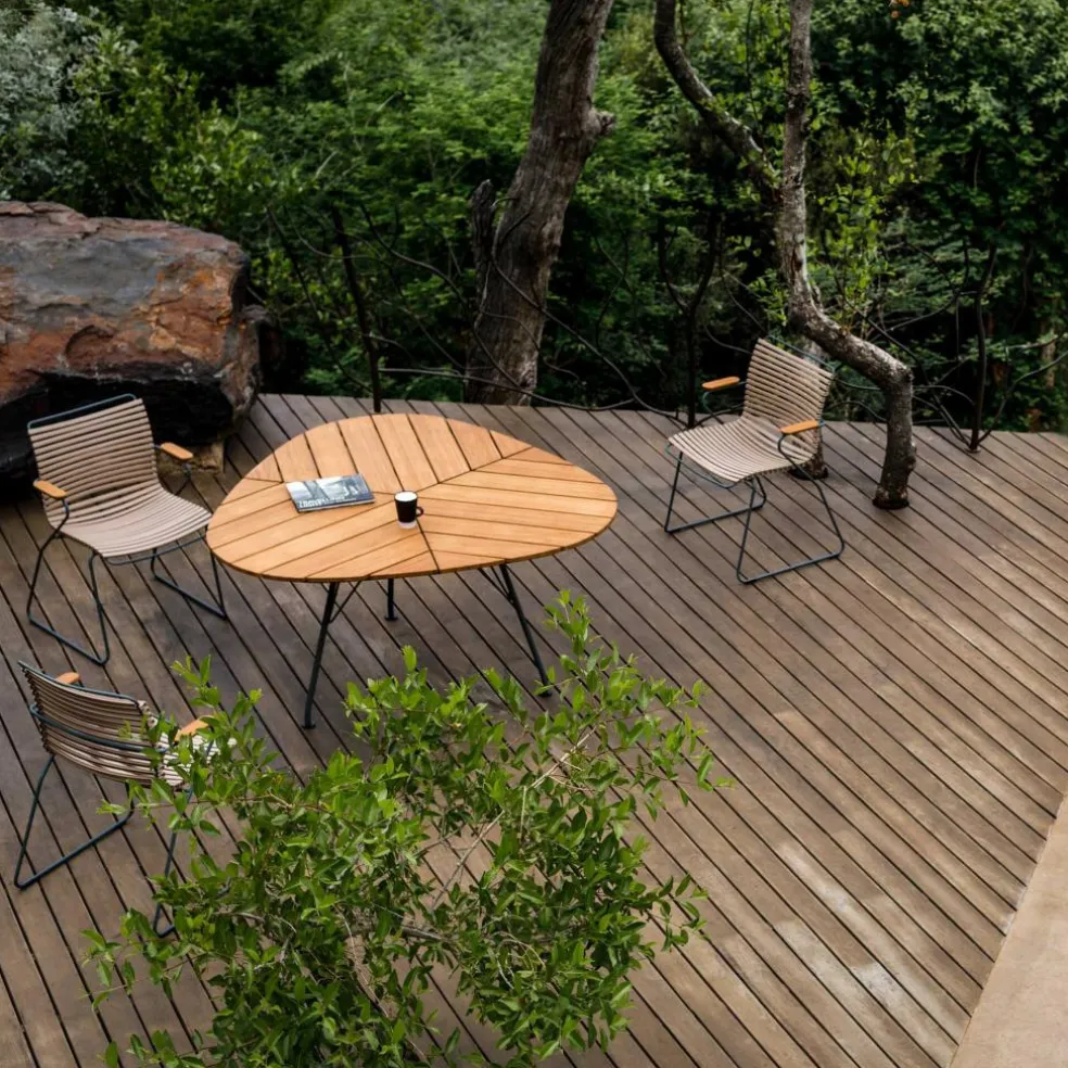 Inspiriert von der Natur erinnert seine besondere, dreieckige Form mit sanft gerundeten Ecken an ein überdimensionales Blatt – eine Assoziation, die durch die kunstvolle Anordnung der Bambus-Lamellen auf der Tischplatte noch verstärkt wird. Mit einem Durchmesser von 146 cm bietet der Leaf Gartentisch Ø 146cm großzügigen Platz für bis zu sechs Personen und wird so zum idealen Mittelpunkt für gesellige Stunden im Freien. Die Tischplatte aus natürlichem Bambus verleiht dem Design Wärme und Authentizität, während das filigrane, dennoch robuste Gestell aus pulverbeschichtetem Stahl für Stabilität und modernen Kontrast sorgt. Mit einer Höhe von 74,5 cm und einem Gewicht von 30,4 kg steht der Tisch sicher und fest – auch bei wechselnden Witterungsbedingungen. Da Bambus ein lebendiges Naturmaterial ist, verändert es im Laufe der Zeit seine Farbe und entwickelt eine individuelle Patina. Dieser natürliche Alterungsprozess macht jedes Möbelstück einzigartig. Um die Oberfläche dauerhaft zu schützen und ihre Schönheit zu erhalten, sollte der Tisch regelmäßig mit speziellem Bambus-Öl behandelt werden. Dabei ist es wichtig, den Tisch nicht abzudecken, da das Holz Luftzirkulation braucht. Zur Reinigung reicht ein weiches, feuchtes Tuch – aggressive oder scharfe Reinigungsmittel sollten vermieden werden, um das Material nicht zu beschädigen.