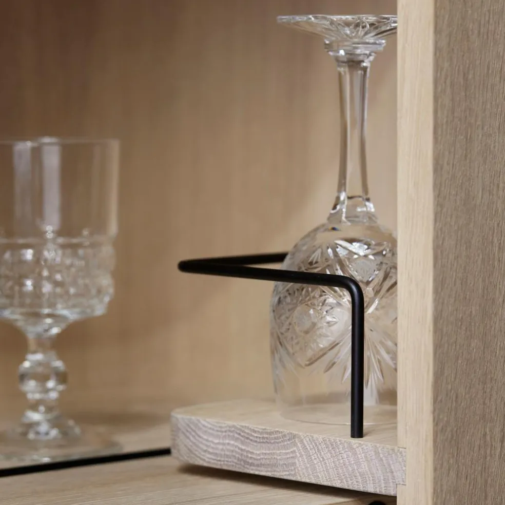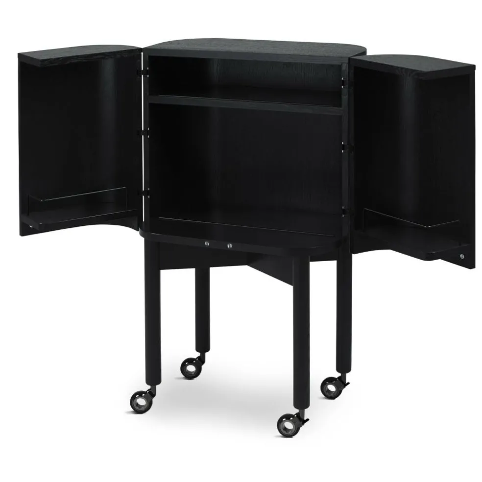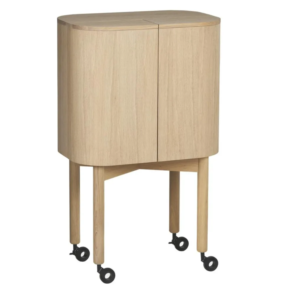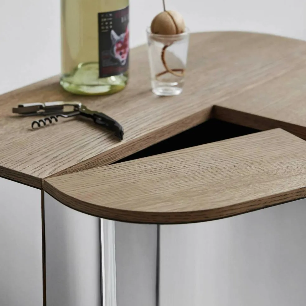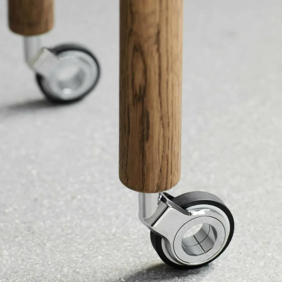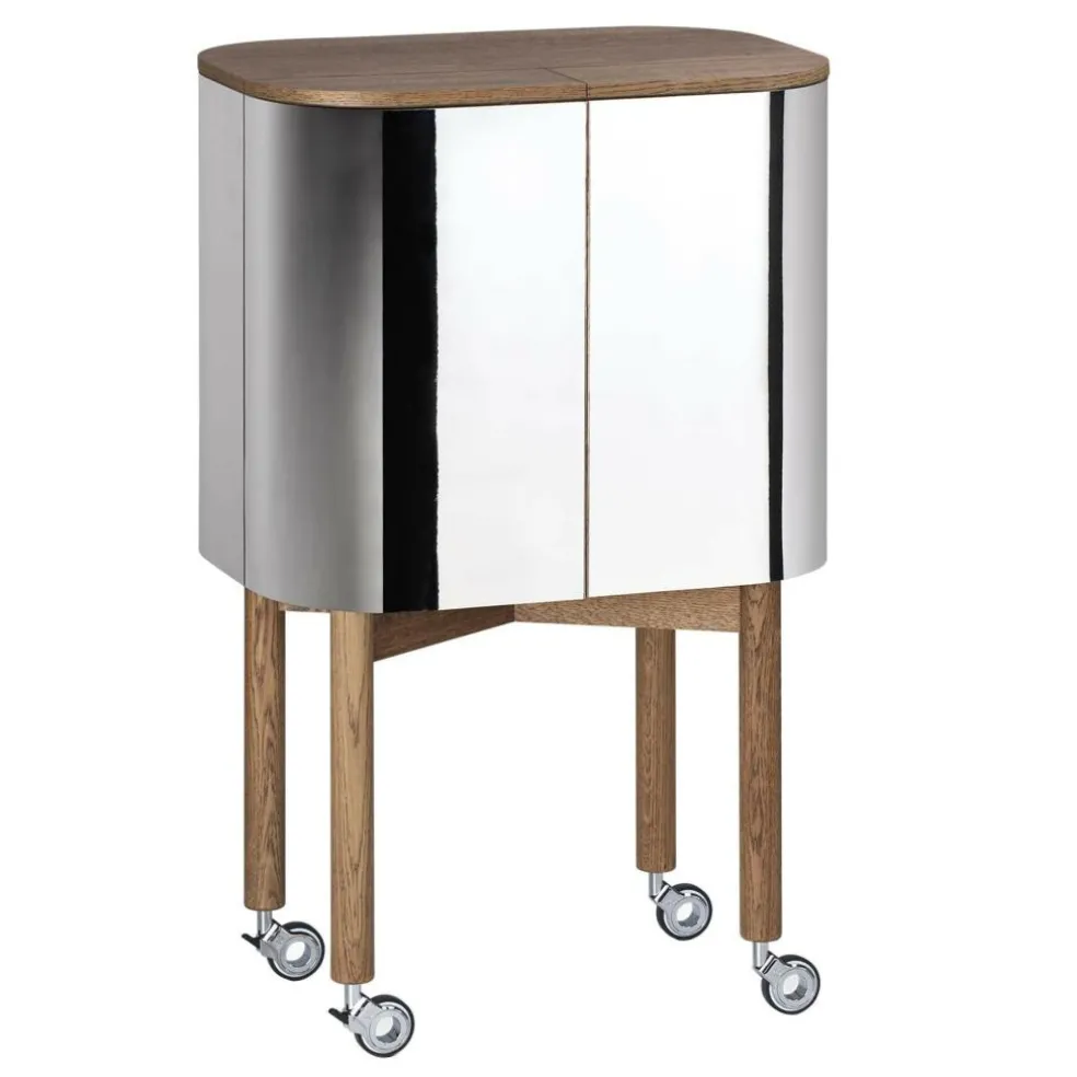 Als Basis für den Loud Barwagen dient ein edles Gestell aus Eichenholz. An der Unterseite der vier massiven und geraden Füße sind Stahlrollen mit einer Gummibeschichtung montiert. Den Loud Barwagen gibt es in zwei Ausführungen: Ganz schlicht ist die lackierte Variante gestaltet, die gänzlich aus Eichenholz besteht. Zum Glanzlicht in jedem Raum wird der Loud Barwagen mit Spiegelfronten. Die Oberflächen bestehen bei diesem Modell aus poliertem Aluminium-Laminat. Die Beine, das Gestell und die Tischplatte sind aus geräuchertem Eichenholz hergestellt.