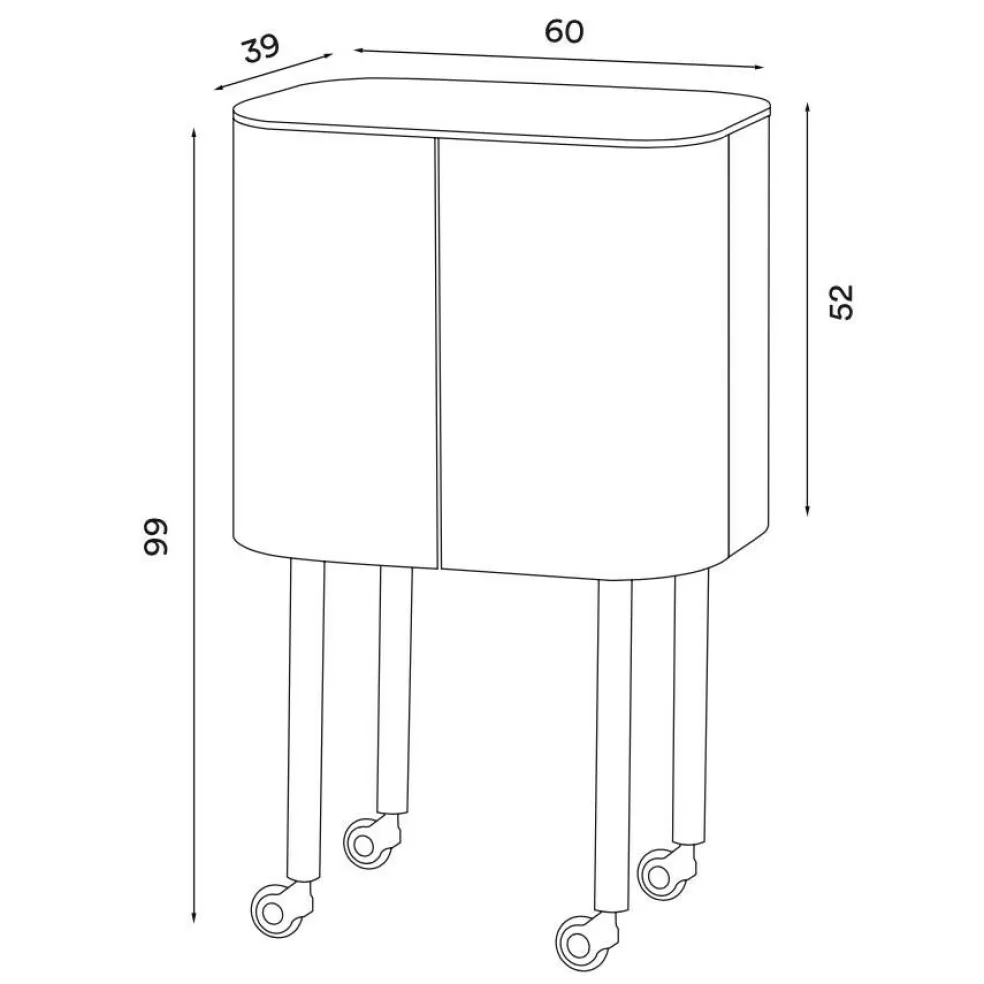 Die Innenseiten der Türen des Barwagens sind mit Abstellflächen für Flaschen ausgestattet. Dünne Metallrahmen verhindert ein Herausrutschen der darin abgestellten Getränke. Der Barwagen ist 60 cm breit. Die Höhe beträgt 99 cm und die Tiefe 39 cm. Der Loud Barwagen wiegt 16,5 kg. Der Korpus ist 52 cm hoch.