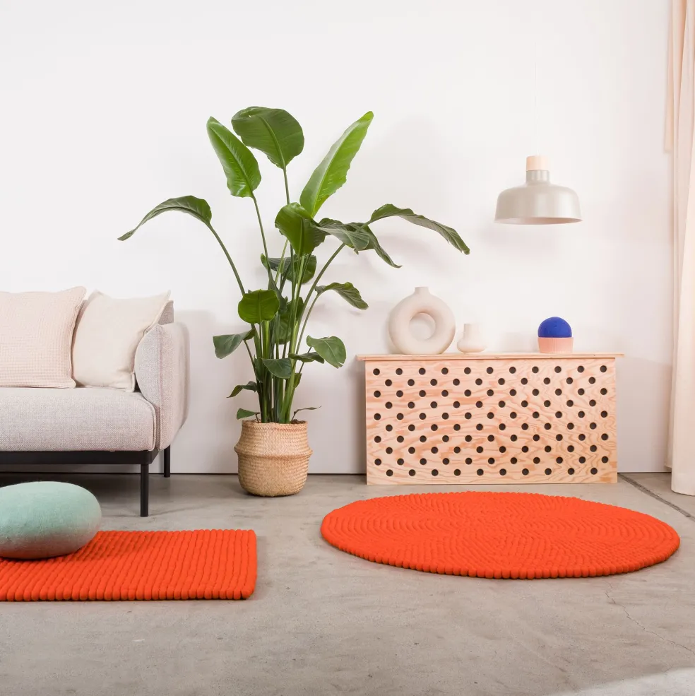 Für den Mats Filzkugelteppich rechteckig verwenden die Designer 100 Prozent Schurwolle. Das Material stammt von in Neuseeland artgerecht gehaltenen Schafen. Die Partnerbetriebe sind Mitglieder des Farmerverbundes New Zealand Wool Services International Ltd, der streng auf Tierschutz achtet. In Handarbeit werden die Wollfasern ausgerichtet, gewaschen und gefärbt. Jede einzelne Filzkugel wird von Hand geformt und vernäht. Da auf faire Arbeitsbedingungen geachtet wird, trägt jeder Mats Filzkugelteppich rechteckig das Good-Weave-Siegel. Das Design ist schlicht und beschränkt sich auf einen rechteckigen Schnitt. Die Filzkugeln sorgen für eine einzigartige Struktur, die den Reiz des Mats Filzkugelteppichs rechteckig ausmacht.