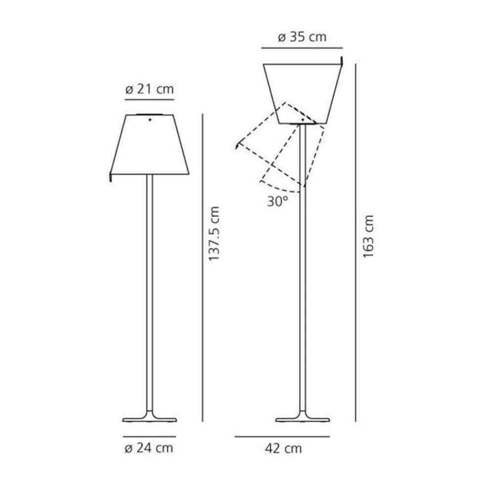Der Schalter der Melampo Terra Stehleuchte befindet sich im 200 cm langen Kabel. Die Leuchte ist 137,5 cm hoch. Wenn der Schirm nach oben gedreht wird erreicht sie eine Höhe von 163 cm. Der Sockel hat einen Durchmesser von 24 und der Schirm einen Durchmesser von 21 cm. Die Melampo Terra Stehleuchte braucht zwei Leuchtmittel mit E27-Fassungen.