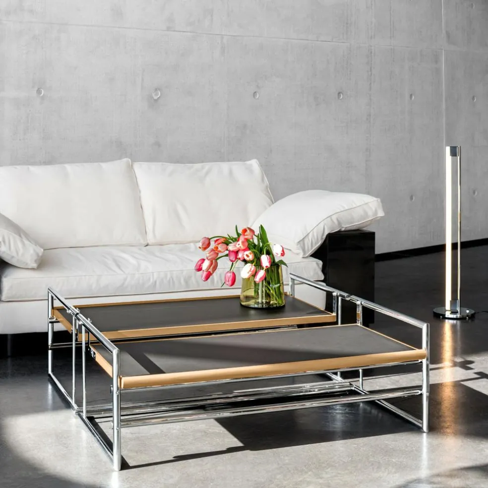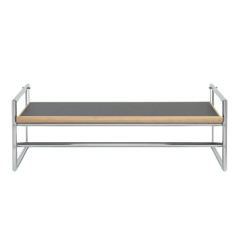 Sein modernes Design mit einem interessanten Materialmix zeichnet den Menton Beistelltisch höhenverstellbar aus. Ein Gestell aus verchromtem Stahlrohr mit drei horizontalen Mittelstreben trägt die Tischplatte aus Linoleum mit Kanten aus Buchenholz. Der Tisch misst 126cm in der Länge und 56cm Breite bei einem Gewicht von 25kg. Die Tischplatte ist mit Drehgelenken am Gestell befestigt und lässt sich als besonderer Clou mit einer einfachen Drehung verstellen. Dreht man das Gestell, wird aus dem Couchtisch im Wohnzimmer mit einem Handgriff ein praktischer Esstisch mit 65cm Höhe. Er kann auch in einer niedrigen Position mit 43cm Höhe arrangiert werden. Als besonderes Detail sind beide Seiten des Tisches in verschiedenfarbigem Linoleum gearbeitet, sodass sich je nach ausgewählter Höhe ein unterschiedliches Design ergibt.