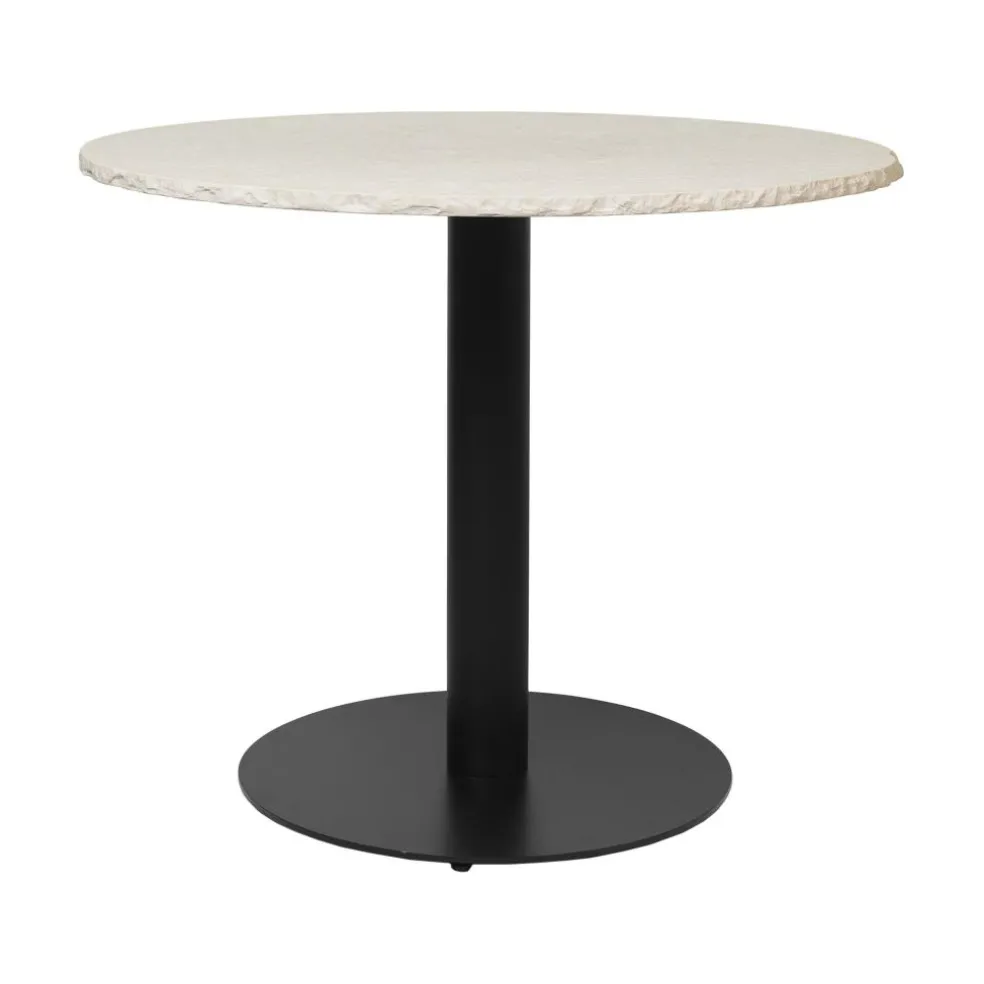 Beim Mineral Esstisch ist es die weiße Steinplatte, die für einen edlen Hingucker sorgt. Sie besteht aus Bianco-Curia-Marmor und macht dank dessen natürlicher Beschaffenheit und der gebrochenen, von Hand gemeißelten Kante jeden Mineral Esstisch zum Unikat. Die mit einer diamantbestückten Bürste behandelten und belederte Oberfläche ist beständig gegen Wasserflecke. Einen deutlichen Kontrast zur hellen Tischplatte bildet der schwarze Unterbau des Mineral Esstisches. Dieser setzt sich aus einem einzelnen runden Bein und einer kreisrunden Fußscheibe zusammen. Sie bestehen aus pulverbeschichtetem und verzinktem Stahl, was den Esstisch nicht nur stabil und robust macht, sondern auch widerstandsfähig gegen Rost. Der Mineral Esstisch lässt sich einfach mit einem feuchten Tuch reinigen. Er macht sich gut in einem Ensemble mit schwarzen Stühlen und passt ins private Esszimmer ebenso wie in ein schickes Hotel.
