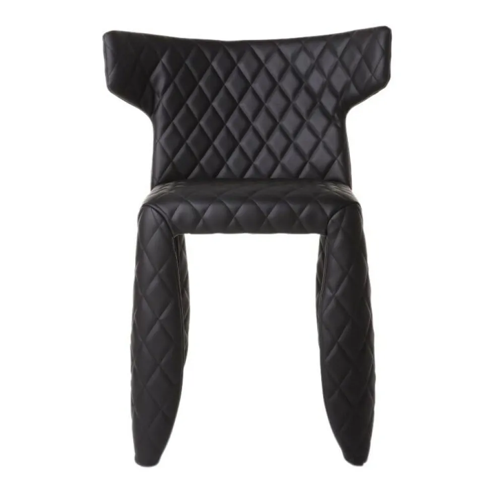 Der Monster Chair zieht in jedem Raum die Blicke auf sich. Auf der Vorderseite der Rückenlehne ist die Gestalt jenes Monsters eingestickt, die dem Modell seinen Namen gibt. Es gibt auch eine Version ohne Stickerei zu kaufen. Unverwechselbar macht den Monster Chair auch die karierte Steppung. Sie zieht sich von der Rückenlehne über die Sitzfläche bis hin zu den sich nach unten hin verjüngenden Beinen. Wer sich traut, in dem Möbelstück Platz zu nehmen, wird mit hervorragendem Sitzkomfort belohnt. Dafür sorgt eine weiche Polsterung. Die breite Rückenlehne trägt ebenso dazu bei, dass man gerne länger in dem Stuhl sitzt. Die Oberkante ragt deutlich über die Sitzfläche hinaus. Ein Gestell aus Stahl gewährleistet dem Monster Chair Standfestigkeit. Auffallend sind die breit geschnittenen Beine.