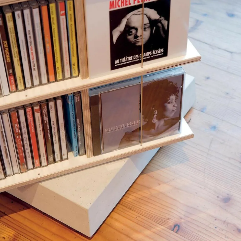 Die Böden vom Musikstapler CD-Regal sind aus dem innovativen Material FU Multiplex Birke gefertigt. Sie bieten eine pflegeleichte Oberfläche und lassen sich einfach mit einem feuchten Tuch abwischen. Der Sockel aus weiß-grauem Beton hat die Abmessungen von 34 x 14,5 x 34 cm B x H x T . Er sorgt selbst bei vollständig gefülltem CD-Regal durch sein Eigengewicht für einen sicheren Stand. Das Regal ist auf dem Sockel drehbar. Hierdurch lässt sich einfach in der Musiksammlung stöbern und die Entnahme einzelner Tonträger fällt besonders leicht.