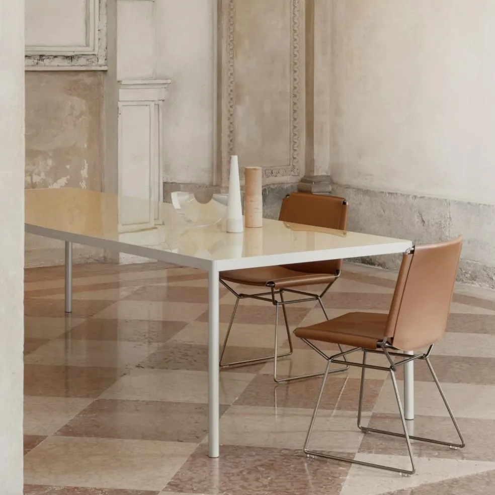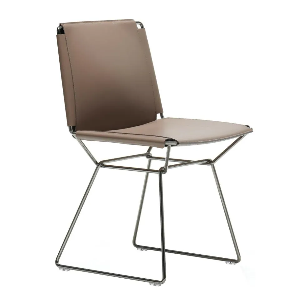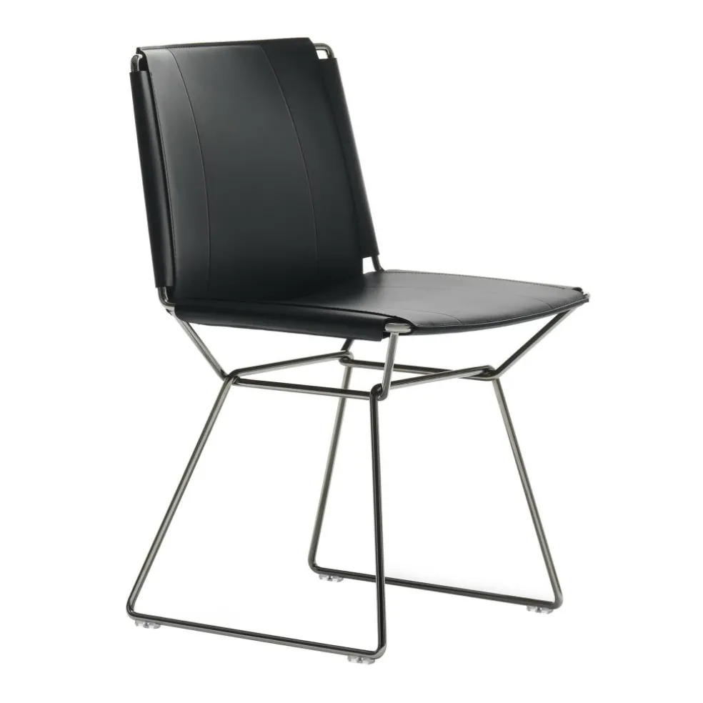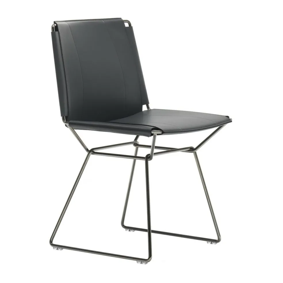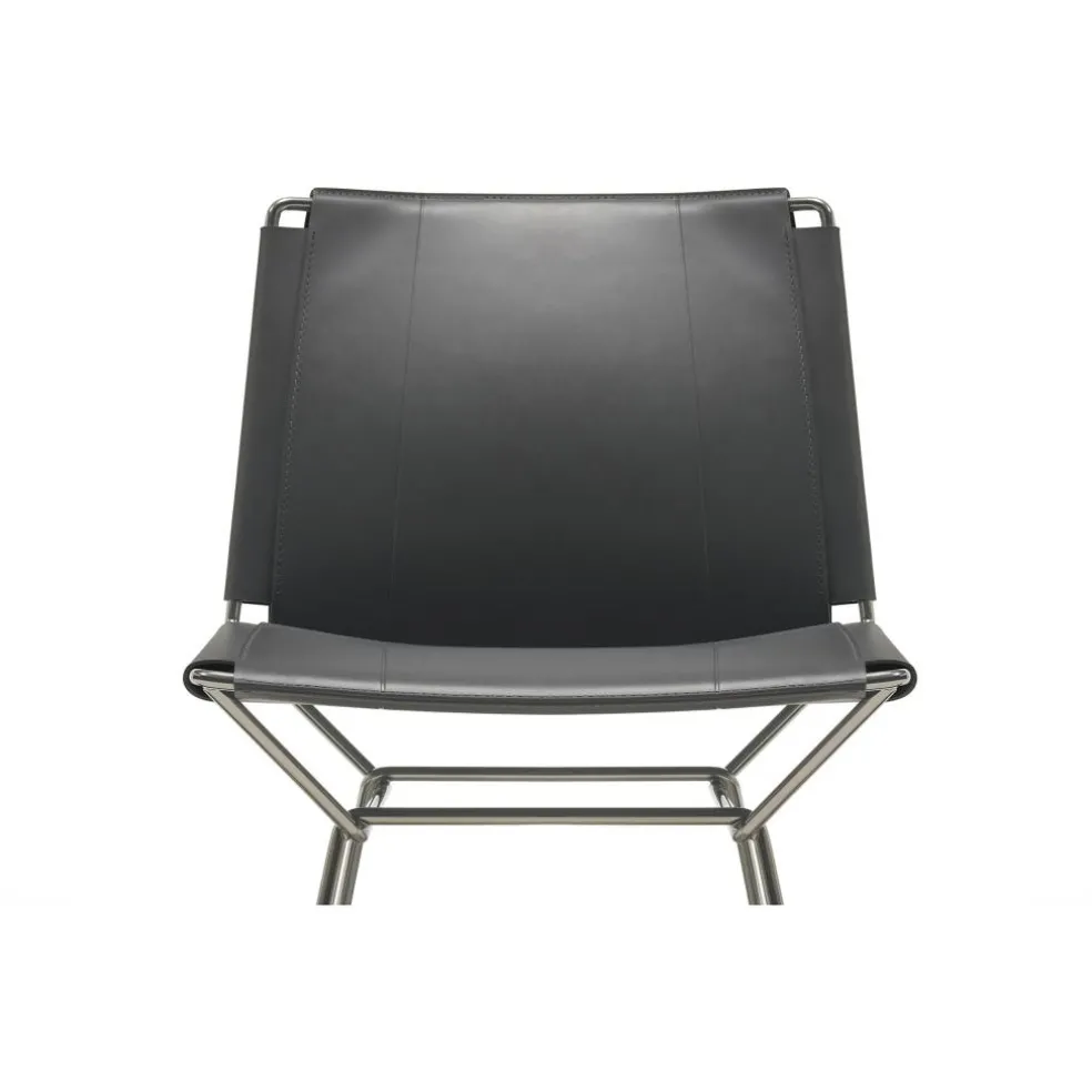 Der Blickfang des puristisch gearbeiteten Stuhls ist das raffinierte Gestell aus verchromtem Stahl. Das Untergestell zeigt eine umgedrehte U-Form, sodass der Stuhl auf zwei Kufen steht. Es wird vom Stahlgestell der Sitzfläche getragen, wodurch eine einzigartige Architektur entsteht. Kleine Schoner aus Kunststoff an der Unterseite der Kufen schützen den Fußboden. Die rechteckige Sitzfläche und die für einen bequemen Sitz leicht nach hinten geneigte Rückenlehne sind jeweils zweilagig mit dickem Sattelleder bespannt. Nähte mit festem Garn und gepresste Rillen verleihen eine haptische Struktur. Das Leder entsteht in Handarbeit in Italien und wird zugunsten einer reduzierten Schadstoffbelastung ökologisch gegerbt.