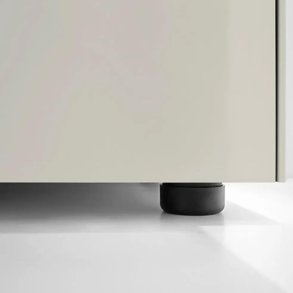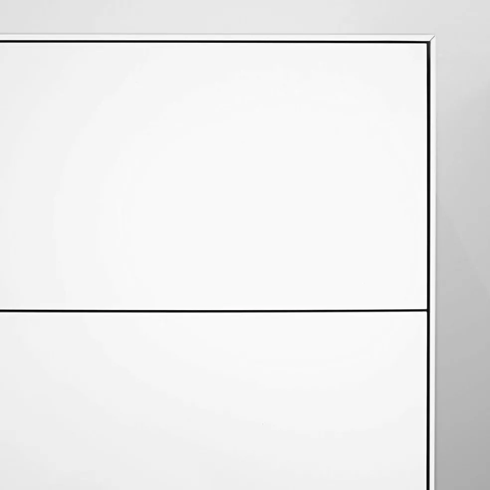 Ob als dekoratives Sideboard im Wohnzimmer oder als praktische Aufbewahrungslösung im Flur: Die Nex Pur Box 2.0 Schubkastenbox/Kommode 120x50x48cm wertet jedes Ambiente auf. Charakteristisch für die Nex-Pur-Kollektion ist der akkurat gefertigte Korpus aus einer oben durchgehenden dünnen Abdeckplatte und Außenseiten, die genauestens auf Gehrung geschnitten sind, perfekt aufeinanderstoßen und so für filigrane Schattenfugen sorgen. Zum Verstauen verfügt die Kommode über zwei breite, übereinanderliegende Schubkästen mit leichtgängigem Auszug. Die grifflose Front strahlt ästhetische Zurückhaltung und Ruhe aus. Mit ihrer glatten, monochromen Oberfläche ist die Kommode in verschiedenen matten Farben erhältlich. Sie ist ausschließlich in Deutschland aus schadstoffarmen Materialien gefertigt und besteht aus hochwertiger MDF. Das Modell steht auf 3cm hohen runden Gleitfüßen, die sich um 1cm justieren lassen. Nicht im Lieferumfang enthalten, aber als Zubehör erhältlich sind 15cm hohe Eckfüße, die der Kommode eine beinahe schwebende Anmutung verleihen.