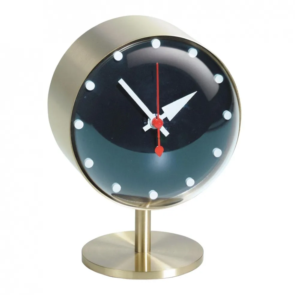Gefertigt ist die Night Clock Tischuhr von Vitra aus einem Standfuß aus Messing. Das Zifferblatt liegt hinter Acrylglas, gewölbt in Fisheye-Optik. Betrieben wird diese Tischuhr von einem Quarz-Uhrwerk inkl. 1,5 V Batterie .