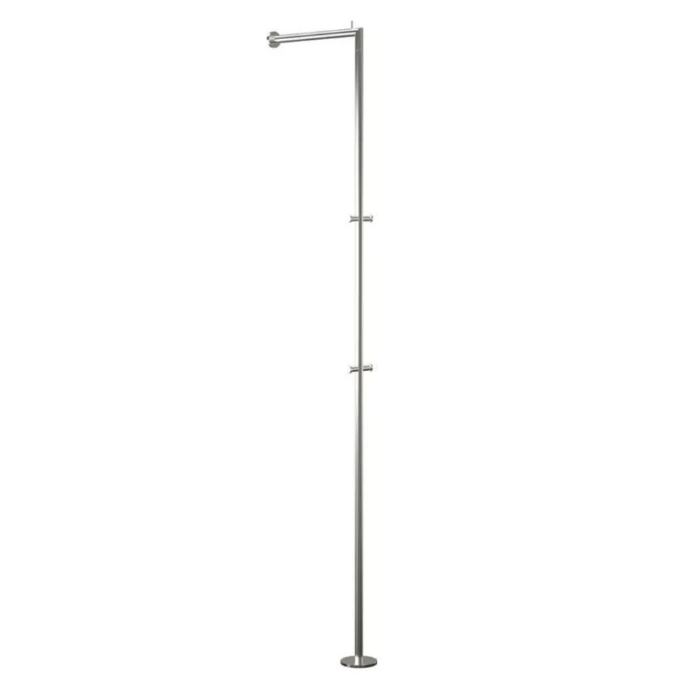 Der elegante Nova Kleiderständer wandlehnend wird von dem Label Frost produziert. Die klare, geradlinige Formensprache kommt ohne Schnörkel und Ballast aus. Der Fokus wurde auf Funktionalität und raumsparendes Design gelegt. Der hochwertige Edelstahl ist fein gebürstet. Das verleiht dem Nova Kleiderständer wandlehnend einen attraktiven seidigen Glanz. Die Höhe beträgt komfortable 170 cm, der Abstand von der Wand liegt bei 35 cm. An der oberen Querstrebe können Sie Kleiderbügel aufhängen. Ein Stopper auf der Oberkante verhindert, dass diese abrutschen. Integrierte Haken dienen als Aufhängung für Taschen oder Jacken.