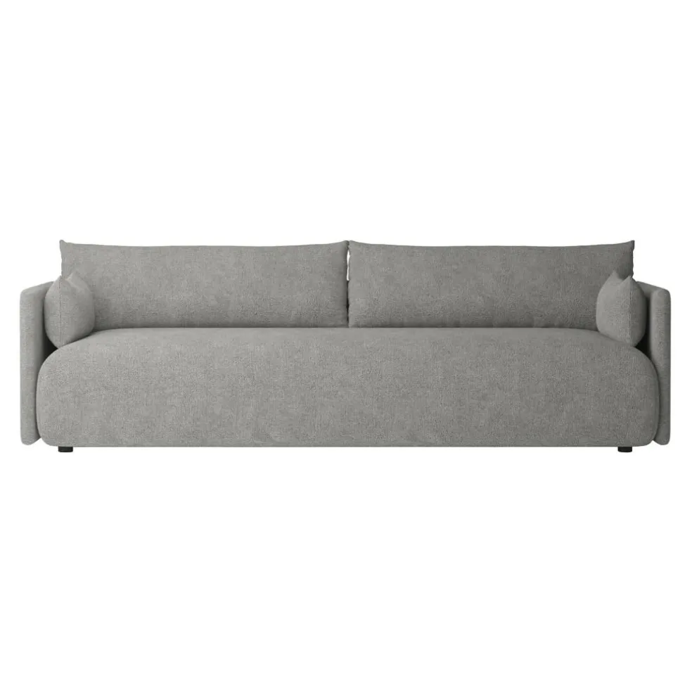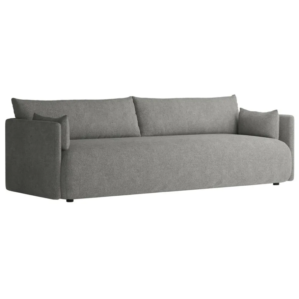 Das Offset 3-Sitzer Sofa wurde von Norm Architects für die Marke Audo entworfen. Das dänische Designstudio setzte auf die skandinavische Designtradition, bei der Minimalismus in Harmonie mit hohem Komfort im Fokus steht. Vor allem die üppig gepolsterten Rückenkissen und die individuell arrangierbaren Kissen an den Armlehnen sorgen für Gemütlichkeit.