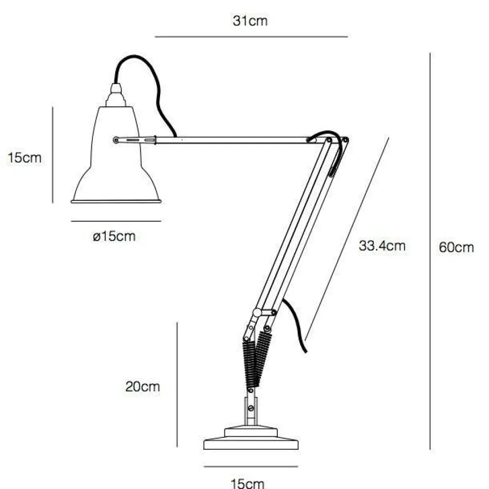 Durch ihre kompakten Abmessungen von nur 31 cm in der Länge, 19 cm in der Breite und 52 cm in der Höhe findet die Leuchte auch auf kleineren Tischen problemlos ihren Platz. Der Schirm misst 15 cm im Durchmesser, der Fuß ebenfalls. Der matte Glanz des Gehäuses und des Ständers wird durch Lackauftrag erzeugt. Die Leuchte selbst besteht aus Metall und ist in den Farben Leinenweiß, Schwarz, Chrom, Taubengrau und Alpinweiß verfügbar. Bei der Chrom-Variante handelt es sich tatsächlich nicht nur um die Optik, hier kommt echtes Chrom zum Einsatz.