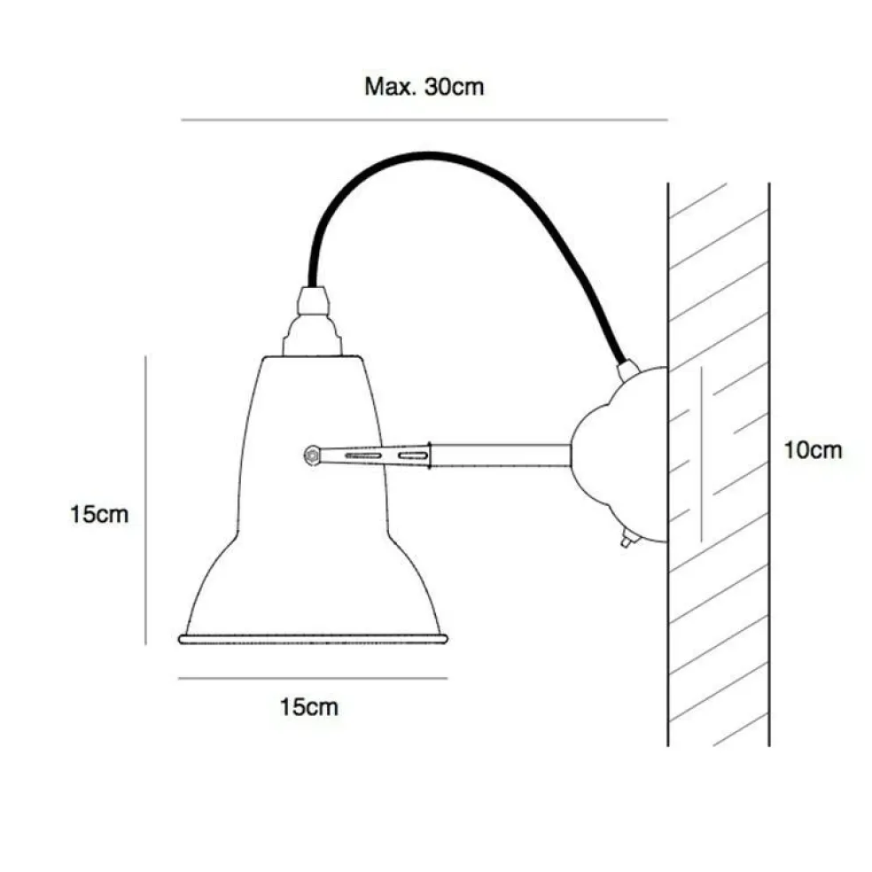 Die Abmessungen betragen 30 cm in der Breite und 15 cm in der Höhe. Der Durchmesser des Schirms ist 15 cm, der des Fußes 10 cm. Durch diese kompakten Maße ist eine unauffällige Installation oder die Anbringung an engen Stellen einfach möglich. Das oben aus der Leuchte herausragende Kabel ist zudem flexibel, was weitere Anpassungen an die Platzverhältnisse ermöglicht. Die Original 1227 Wandleuchte ist in den Farben Leinenweiß und Taubengrau erhältlich, beide bestehen aus lackiertem Stahl und Chrom.
