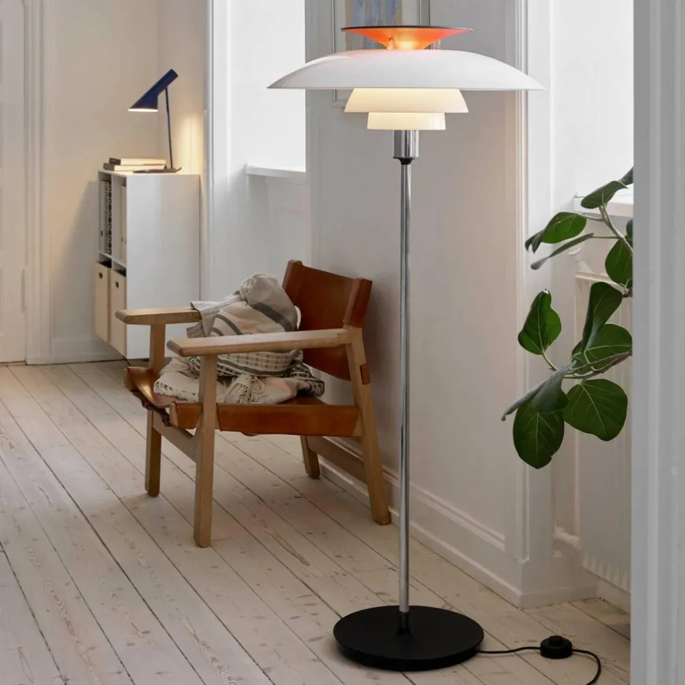 Mit ihrem schuppigen Leuchtenkopf, dem schlanken Metallstiel und der runden Basis aus pulverbeschichtetem Stahl ist die PH 80 Stehleuchte auch unbeleuchtet ein auffälliger Hingucker. Eingeschaltet ist das elegante Designstück Beleuchtungskörper und Lichtskulptur zugleich. Dank ihrer verschiedenen gebogenen Acrly-Schirme strahlt die PH 80 Stehleuchte ein angenehm diffuses und blendfreies Licht ab, das weiche Schatten wirft. Die Lichtstimmung variiert abhängig von der gewählten Ausführung. Der oberste Reflektor färbt den Lichtschein je nach Modellvariante atmosphärisch warm bis klarweiß. Der metallene Leuchtenständer steht in einem attraktiven Kontrast zu den Schirmen oder passt sich diesen harmonisch an.