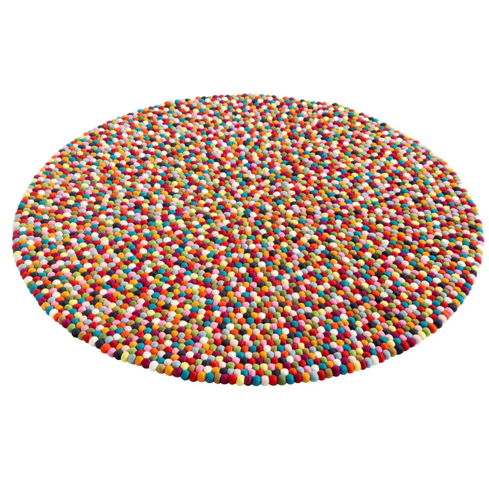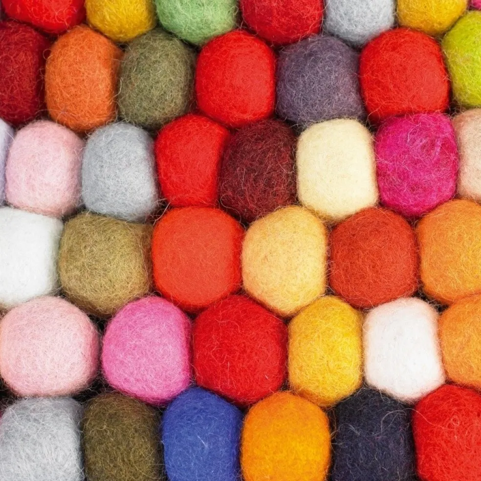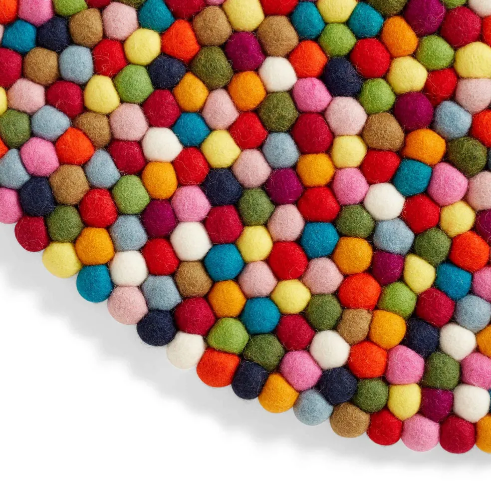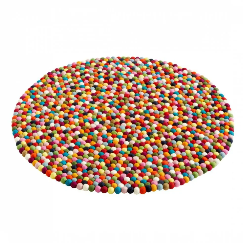 Die Pinocchio Teppiche werden in kleinen nachhaltigen Manufakturen in Nepal von Hand gefertigt, in dem jeder Filz Ball einzeln bearbeitet und anschließend an einen Fade gebunden wird, wie die Perlen einer Kette.