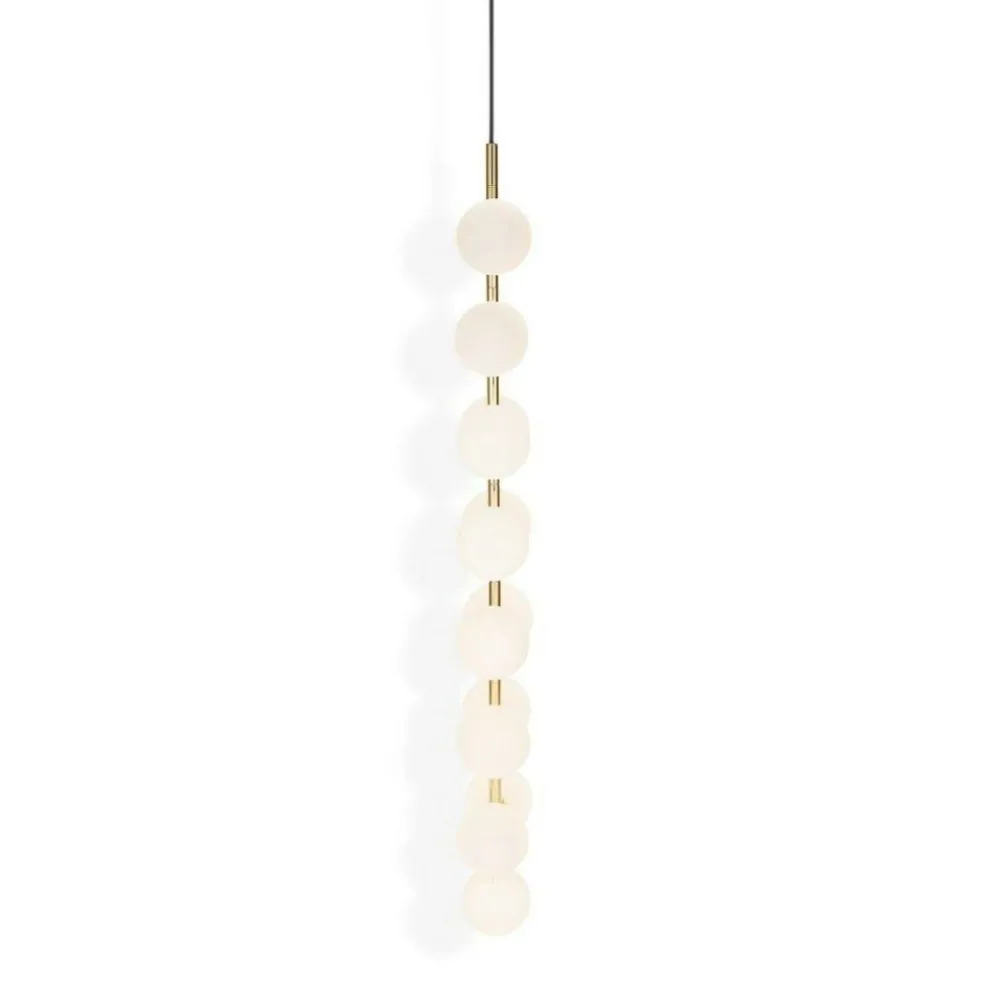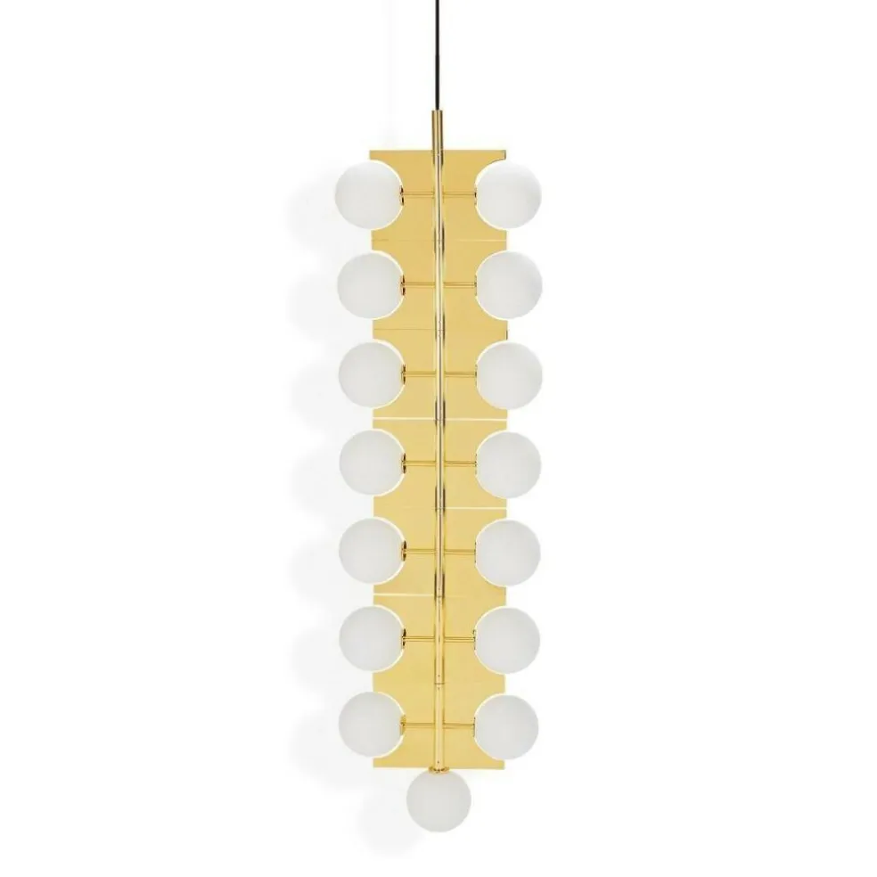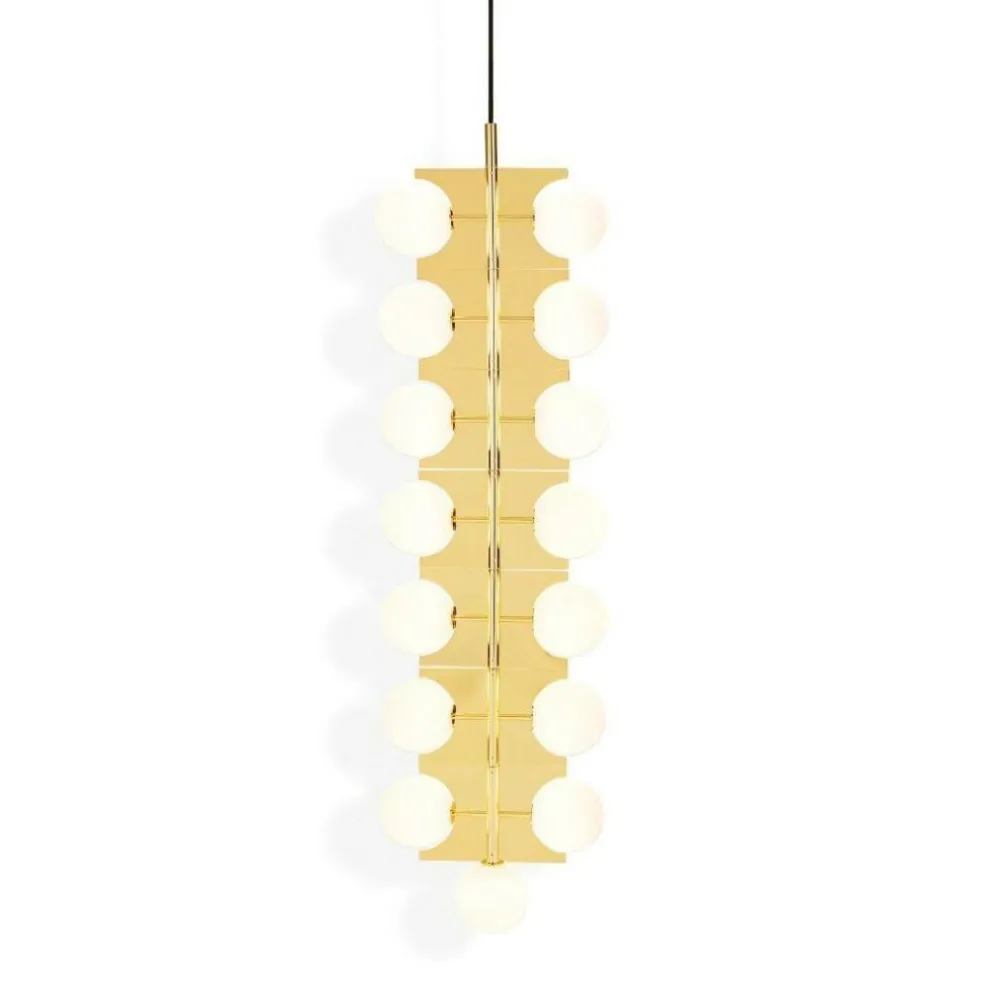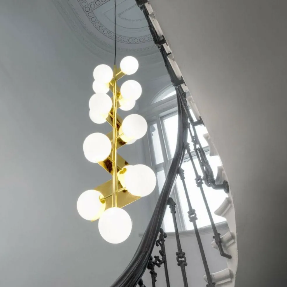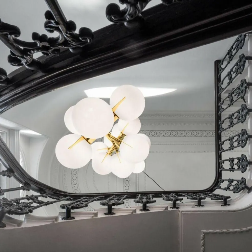 Ideal geeignet ist der aus 15 doppelschichtigen Glaskugeln bestehende Plane Drop Kronleuchter für den Einsatz in Räumen mit hohen Decken, insbesondere in Treppenhäusern, Atrien und Foyers. Die weißen Glaskugeln des extravagant gestalteten Leuchters verteilen sich über sieben rotierende Ebenen. Sie strahlen das Licht in alle Richtungen ab. Gemeinsam mit dem messingbeschichteten Rahmen aus Stahl sind die Kugeln perfekt dazu geeignet, mysteriöse optische Täuschungen zu erzeugen.