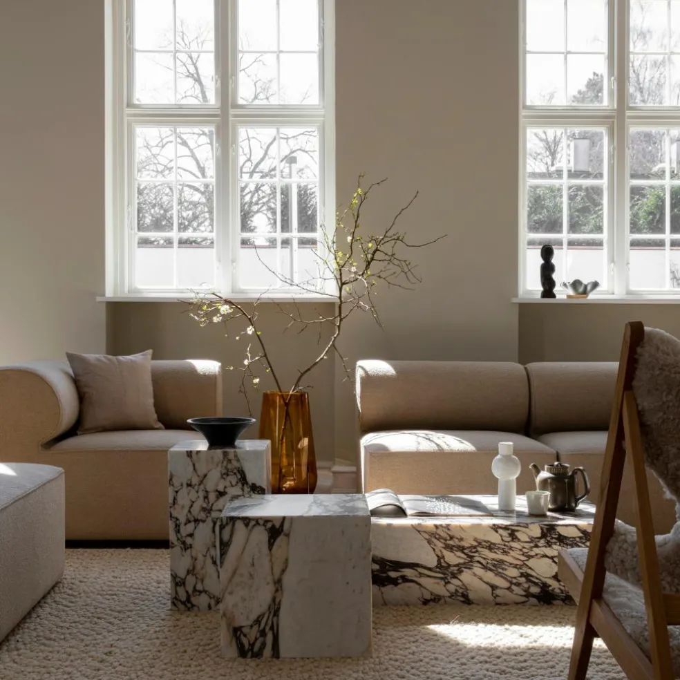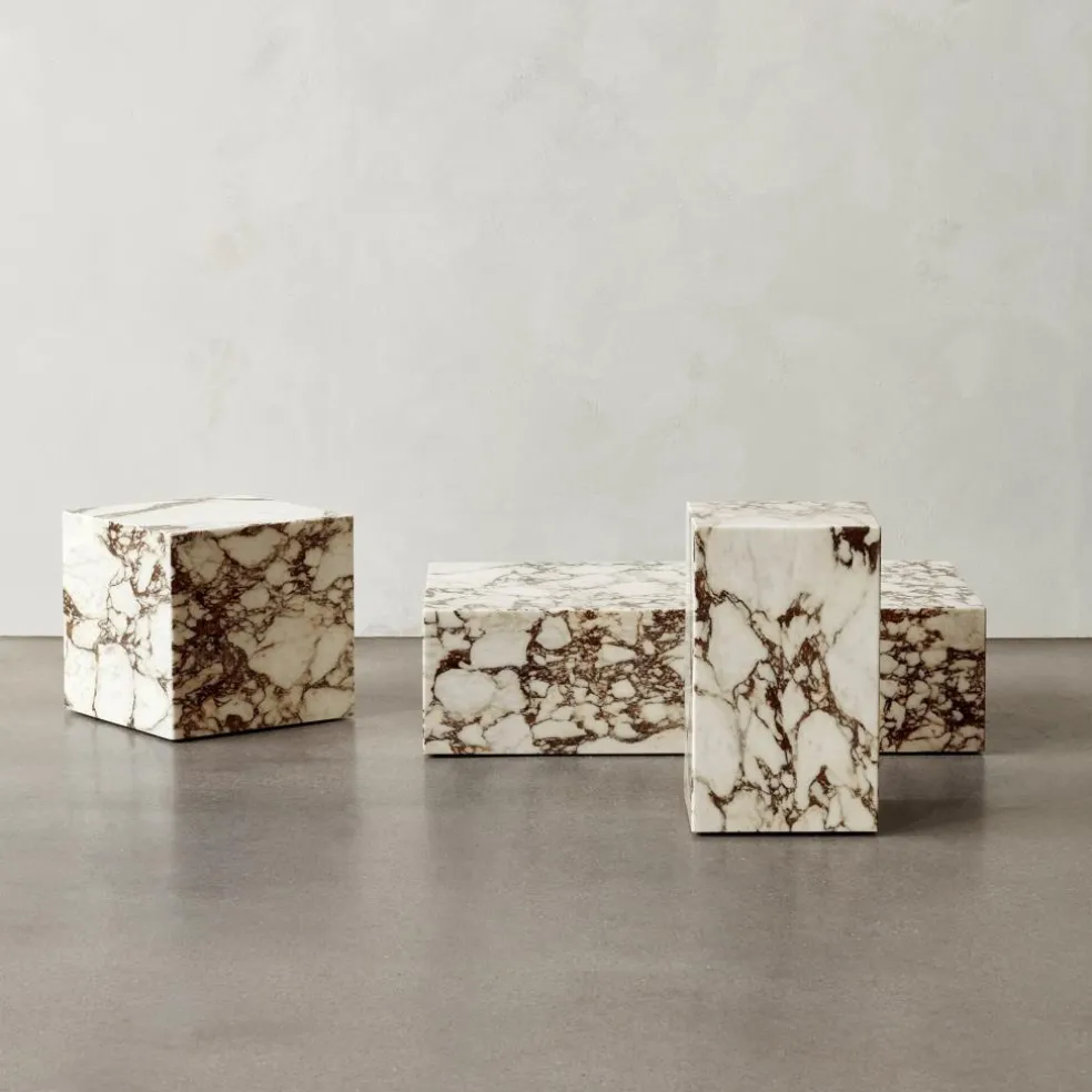 Aus der Plinth-Serie gibt es auch niedrige und hohe Beistelltische, die einen rechteckigen Grundriss haben. Beim Plinth Cubic Beistelltisch handelt es sich um einen Würfel. Zum Blickfang wird er, weil sich die Designer für ein altbewährtes Material entschieden haben, das bereits seit Jahrtausenden Eleganz verbreitet. Der Plinth Cubic Beistelltisch ist nämlich aus Marmor gefertigt. Es gibt den Couchtisch aus Marquina- oder Carrara-Marmor. Da jeder Plinth Cubic Beistelltisch eine einzigartige Maserung aufweist, wird jedes Exemplar zum Unikat. Das Modell wird im privaten Wohnzimmer zum Blickfang, wo es als mondäne Abstellfläche neben dem Sofa dient. Doch auch in der Hotellobby oder in einem eleganten Büro zieht es alle Blicke auf sich. Die Bodenplatte besteht aus MDF, an der Unterseite können Gleiter montiert werden. Sie dienen zur Schonung des Bodenbelags vor Kratzern.